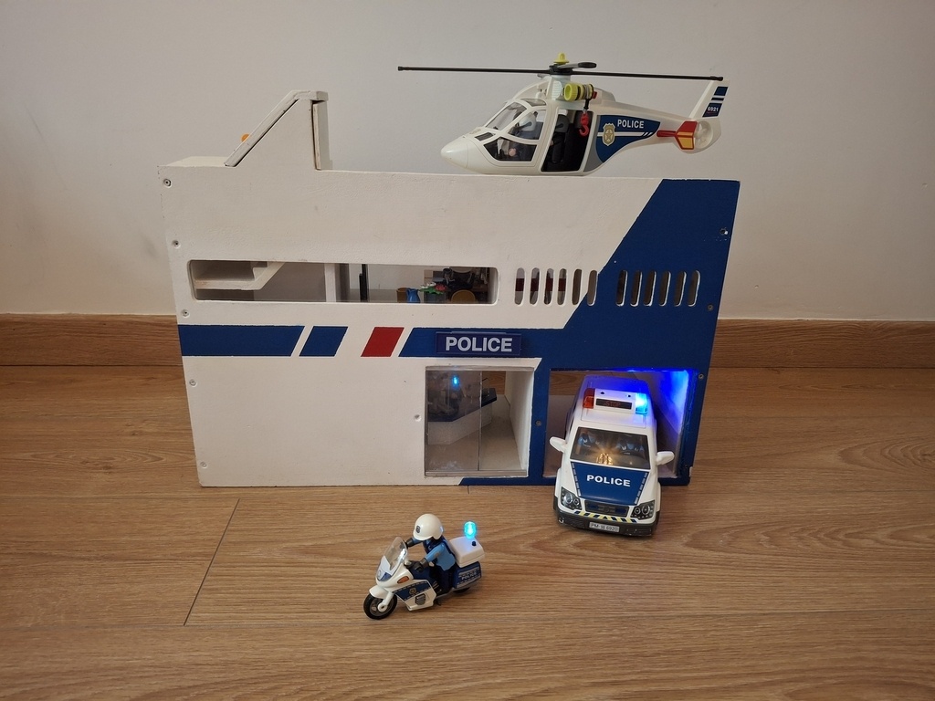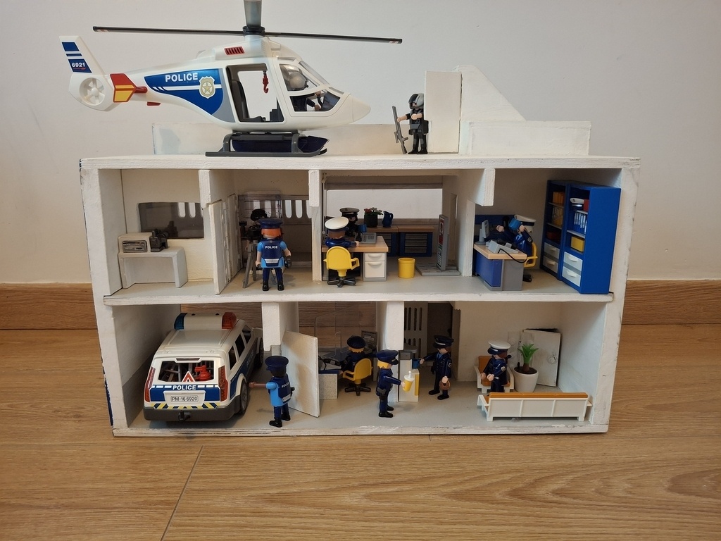 Hôtel de Police pour Playmobils avec bureaux, salle des saisies, salle d'interrogatoire, WC et héliport.