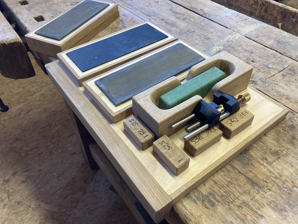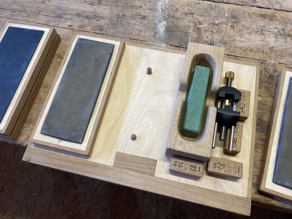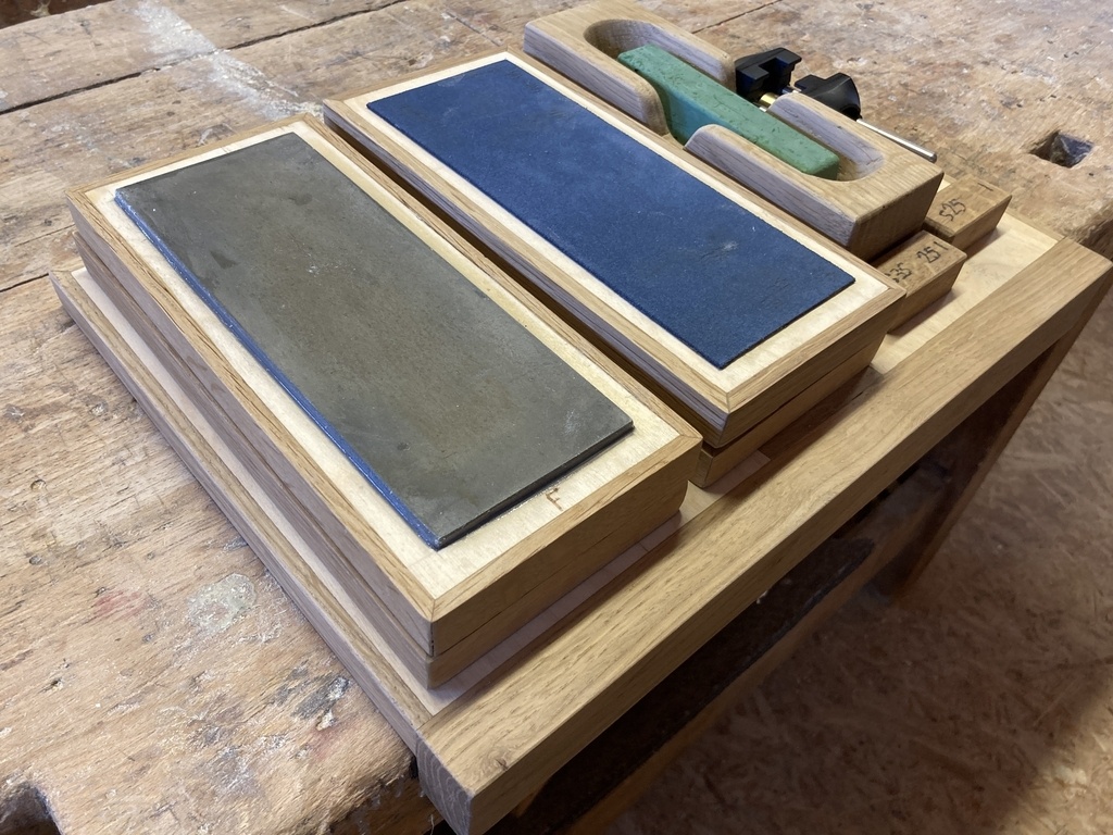 Réalisation en CP de bouleau et chêne de récup (pieds de chaise), fait aux outils à main (sciage, délignage, rabotage, ..., sauf les perçages). Chaque bloc avec les pierres et le cuir peut s'encastrer sur l'autre pour le rangement et se fixe sur les tourillons du plateau principal. Pierres fixées avec du joint silicone anthracite.