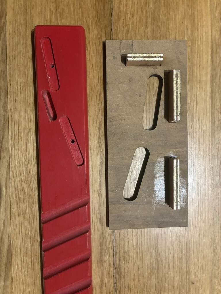 Pour les dossiers, j'ai réalisé des fines languettes de 70mm de large et quelques mm d'épaisseur (entre 1 et 3 grosso modo) à la scie sur table. L'astuce ici qui peut paraître contre intuitive (mais apporte beaucoup de sécurité et praticité) est de régler le guide parallèle sur [épaisseur de la pièce] - [épaisseur de la lame] - [épaisseur de la future languette]. Comme ça, c'est la majorité de la pièce qui est entre la lame et le guide (et on peut pousser dessus facilement) et la languette est libre. Aussi, vu la grande largeur de ces languettes, j'ai opté pour une coupe en 2 fois en retournant la pièce.