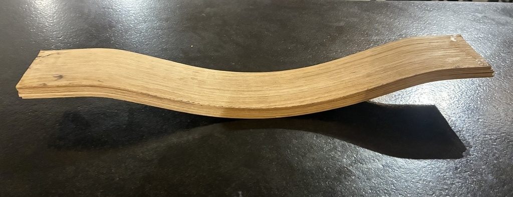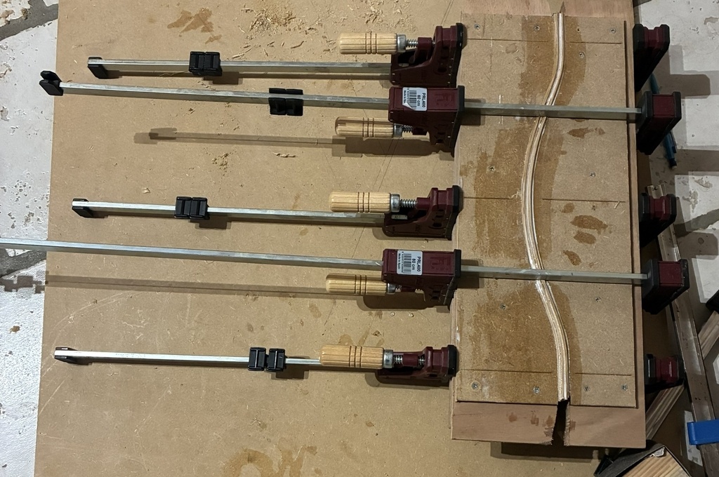 J'ai bricolé une petite chambre vapeur pour y faire tremper mes languettes (en MDF, autant vous dire que c'était une chambre à usage unique ...), puis j'ai encollé et contraint dans le gabarit pendant 48h. Enfin, j'ai ajusté la largeur finale au rabot (il fallait effectivement prévoir quelques mm de marge car les languettes se désalignent lors du serrage via un glissement dû à la colle) puis réalisé les arrondis et l'encastrement dans les montants à la ponceuse.