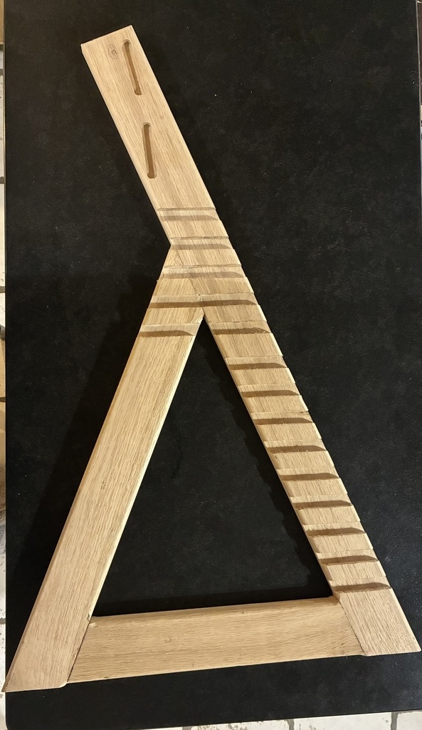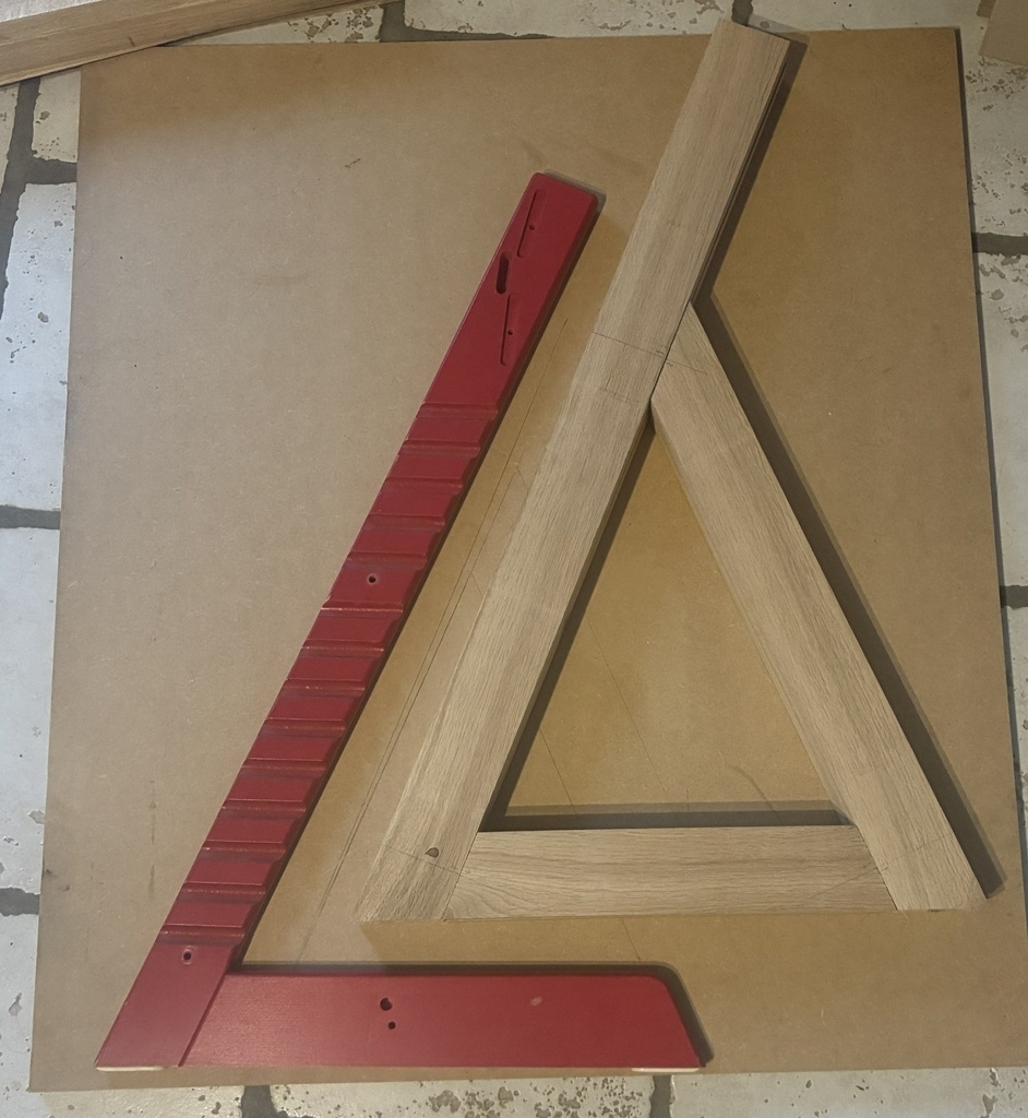 On commence par les montants verticaux. Le questionnement majeur ici tourne toujours autour de la robustesse de l'assemblage entre la section au sol et le grand montant incliné. Ne voulant pas prendre de risque, j'ai opté pour ajouter un soutient en opposition comme vu sur les modèles de la marque Hauck.