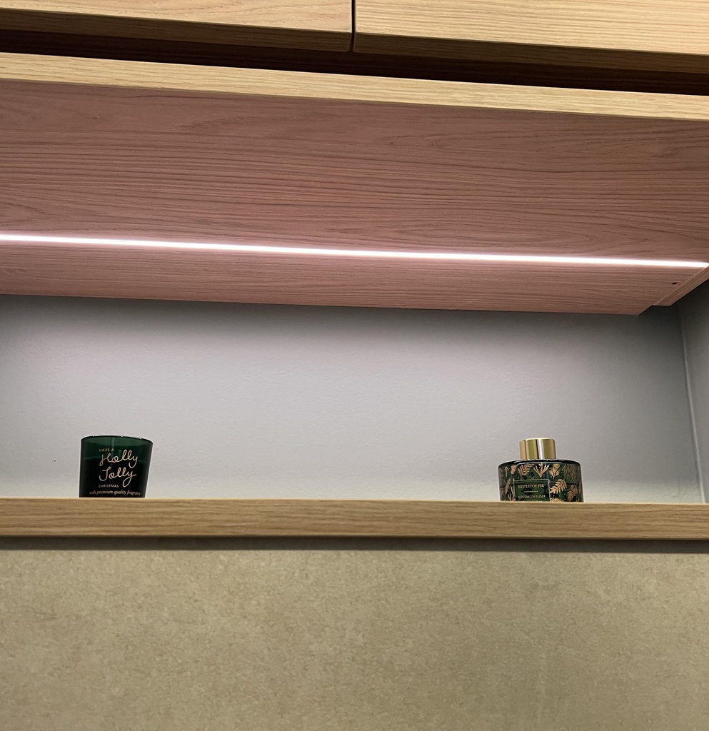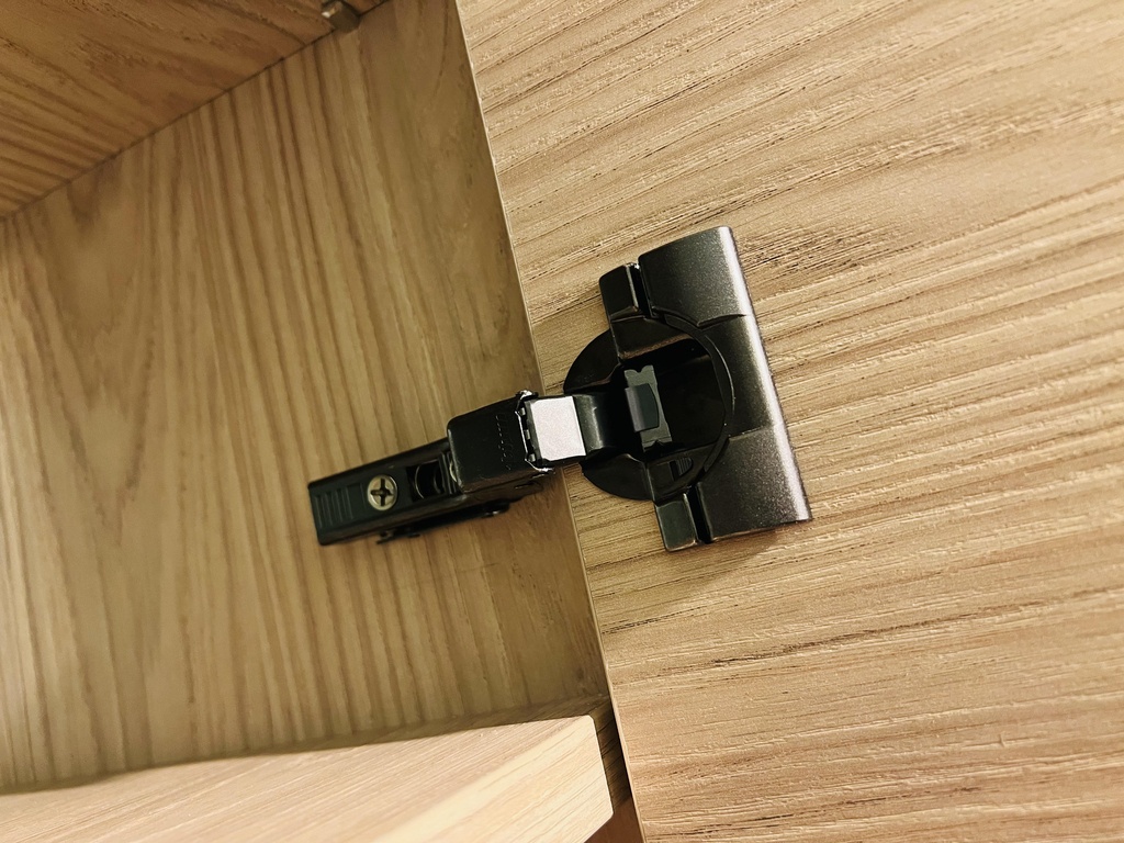 Meuble en panneaux décor chêne Casella de chez EGGER, charnière BLUM noir onyx et embase droite.