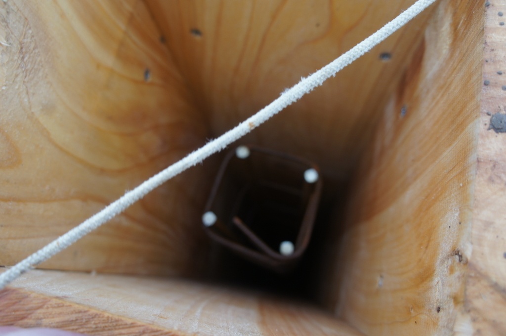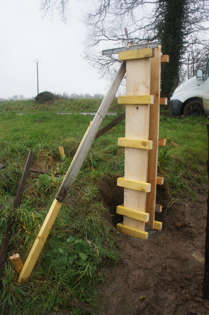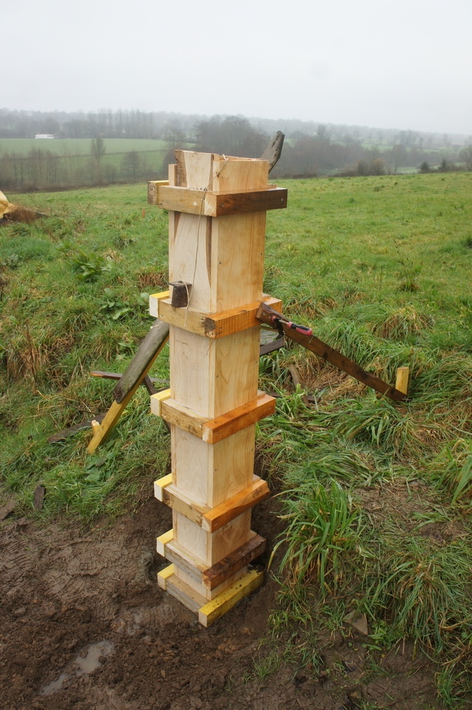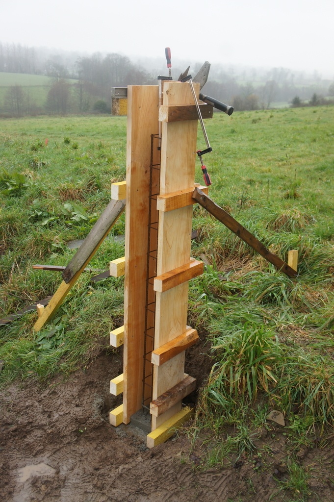 Bonjour, un coffrage de poteau 18x18 pour mon portail de hangar. Pose sur talonette. Planche en cyprés de 30 mm et raidisseurs horizontaux en chevrons. Assemblage par vis pour faciliter le réemploi. Fruit de 5mm/2m donné au poteau.