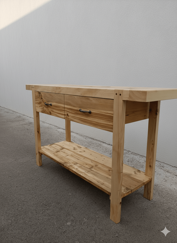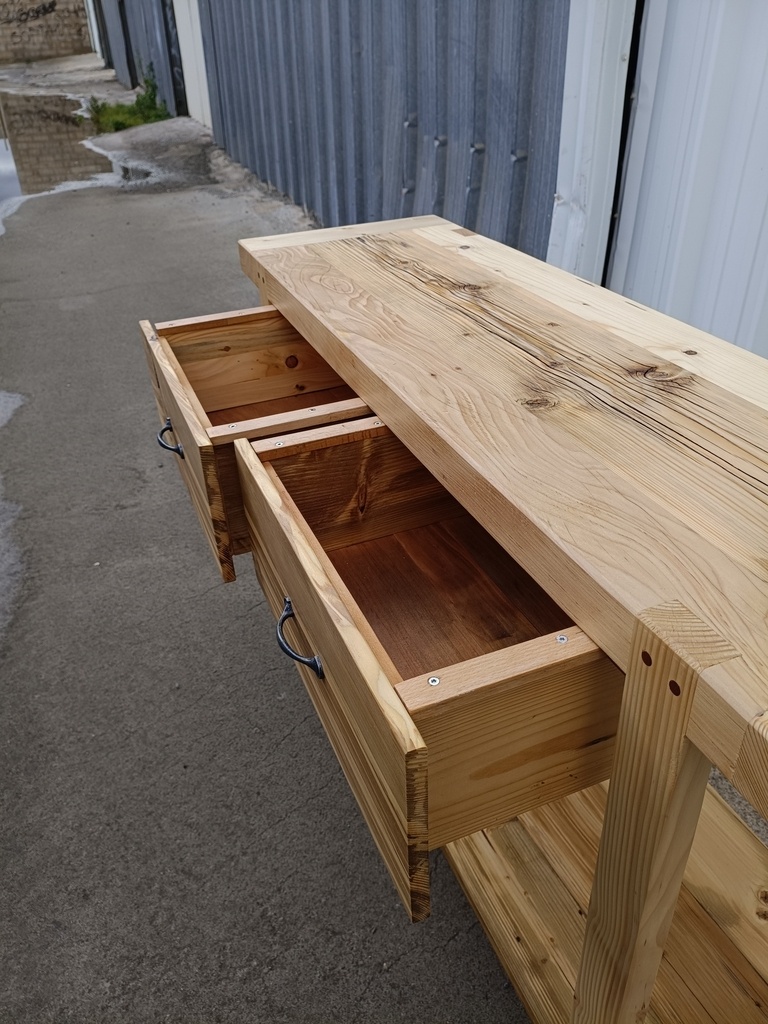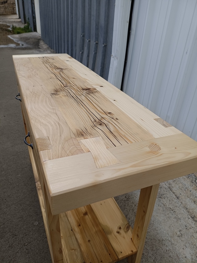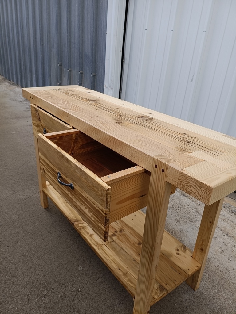 Une console au style d' établi ou meuble de salle de bain ma ton dis. Fais en bois de récupération. La facade des tiroirs viens d'une volige trouve sur un chantier. Je ne me doutais pas que sa rendrait aussi bien avant de l'avoir raboté. Quand le fil est continu ça rend toujours bien.