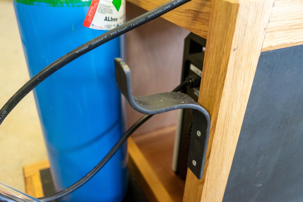 J'ai ajouter, sur l’arrière du meuble, un fer plat que j'ai tordu pour retenir les gaines après coup.