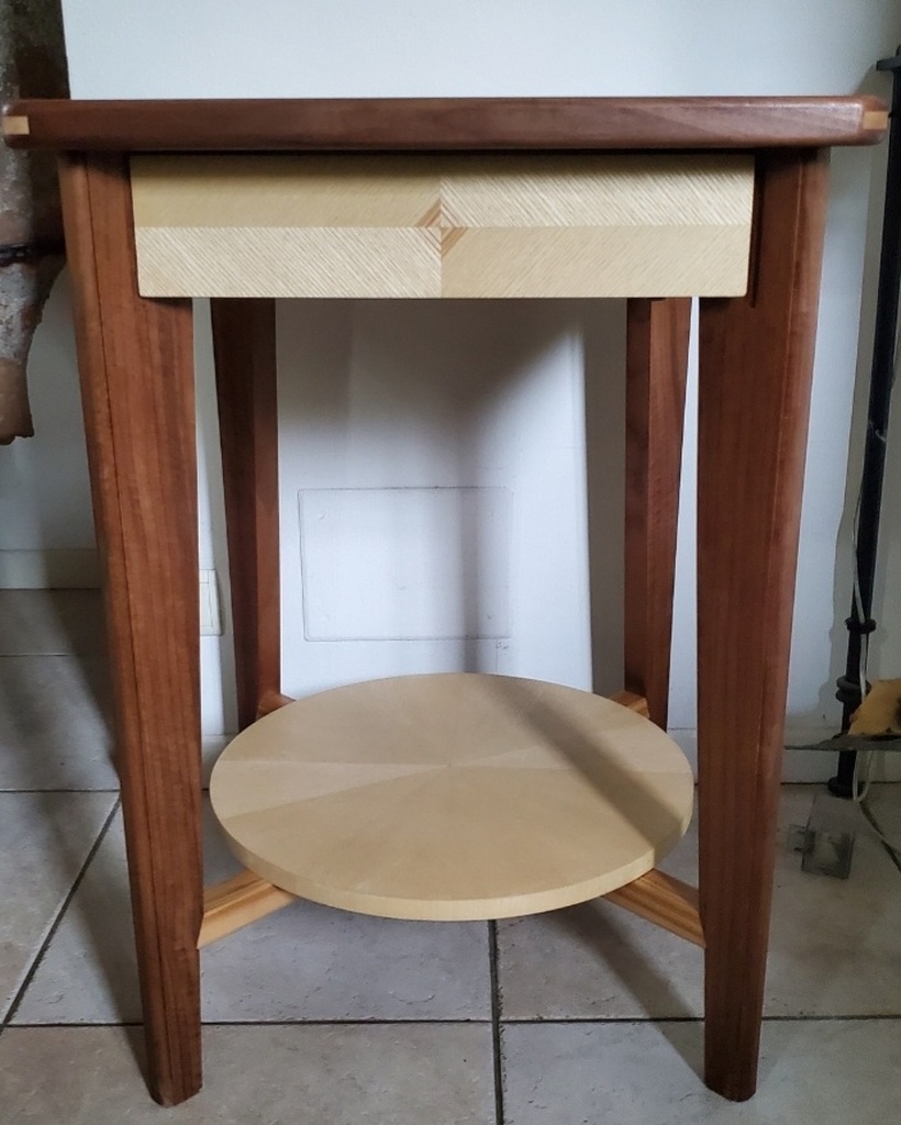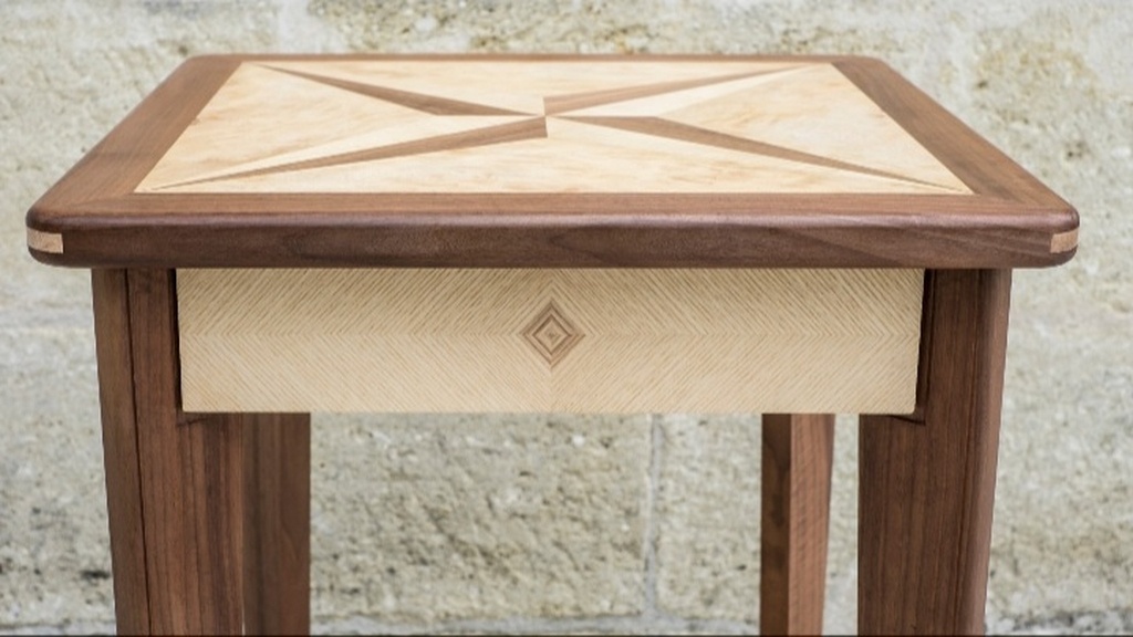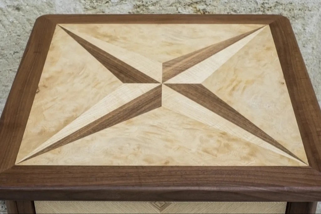 Plateau rose des vents plaqué en Noyer, Frêne ondé, loupe de Frêne Oliver et emboîtures en Noyer massif.Piètement en Noyer massif et traverses plaquées en Frêne Olivier avec frisage en diamant.Plateau inférieur en Frêne avec frisage en soleil.