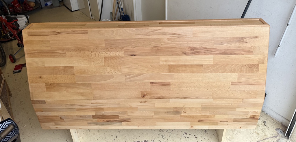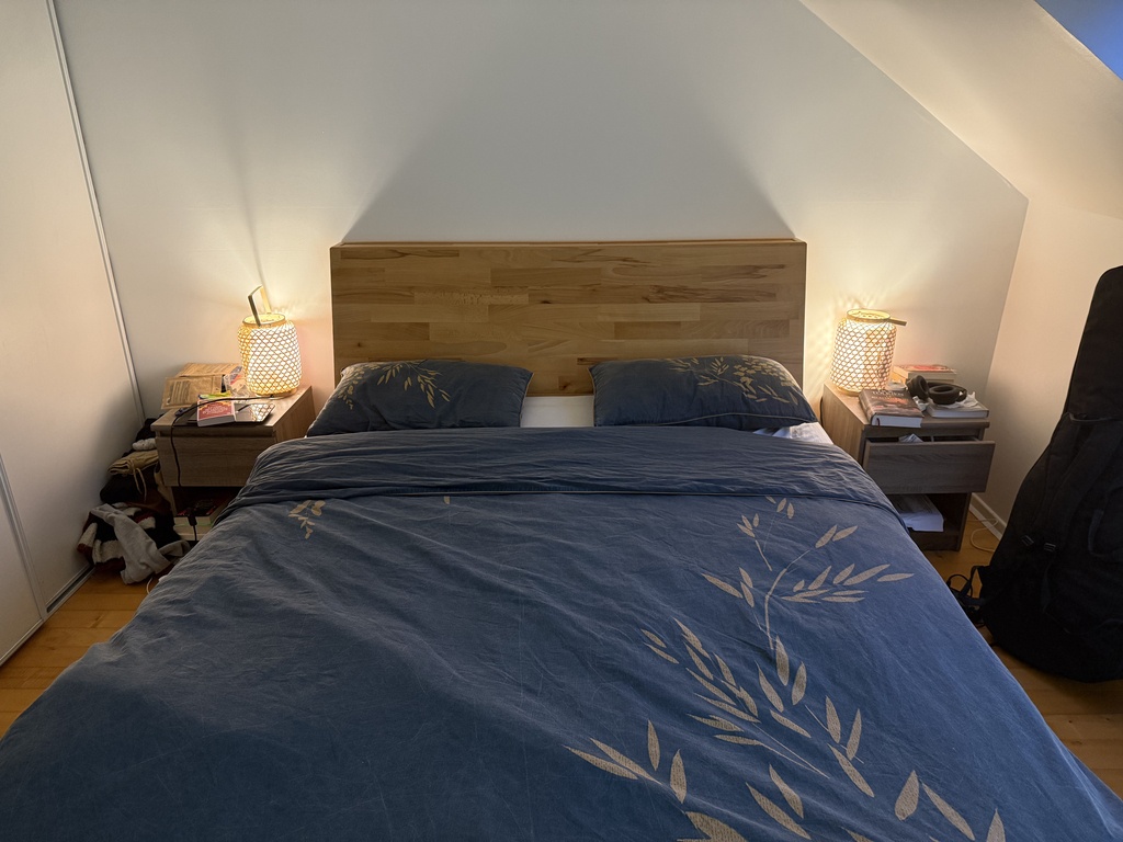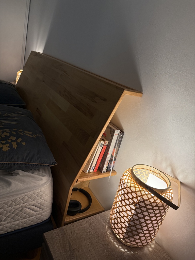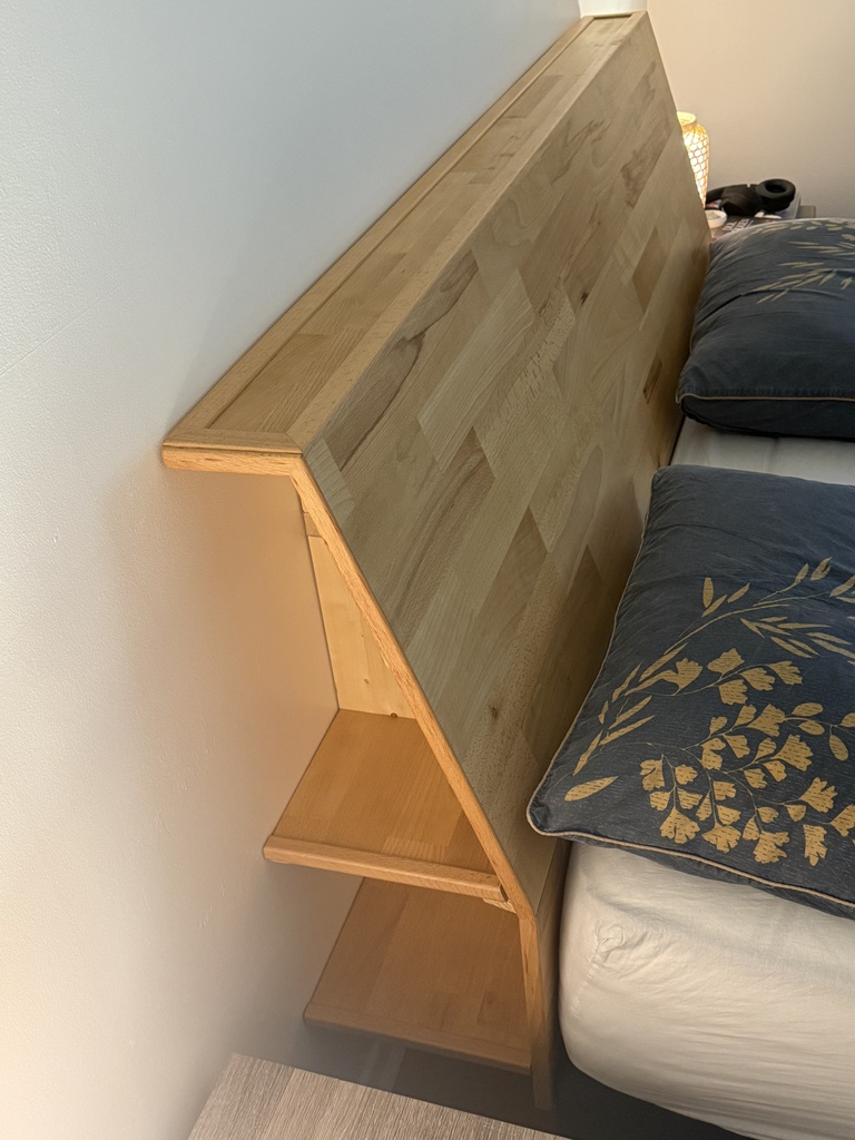 Une tête de lit que j'ai réalisée en panneau de hêtre. La structure est en épicéa. Le pan est incliné comme un dossier de chaise pour être assis plus confortablement dans le lit, et j'ai rajouté quelques étagères à l'arrière.