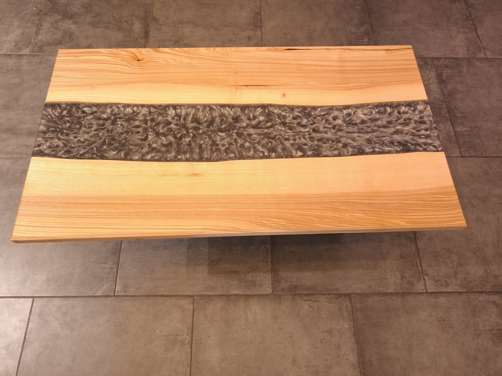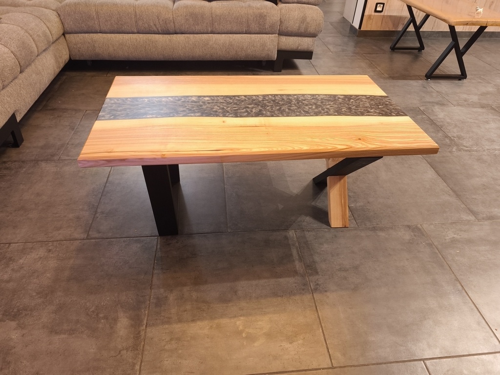 River table en frêne olivier. Pied trapézoïdale en chêne ebonisé et pied en X en chêne ebonisé et frêne olivier assemblage mi-bois. Finition rubio pure et protection Diamond ceramic coating