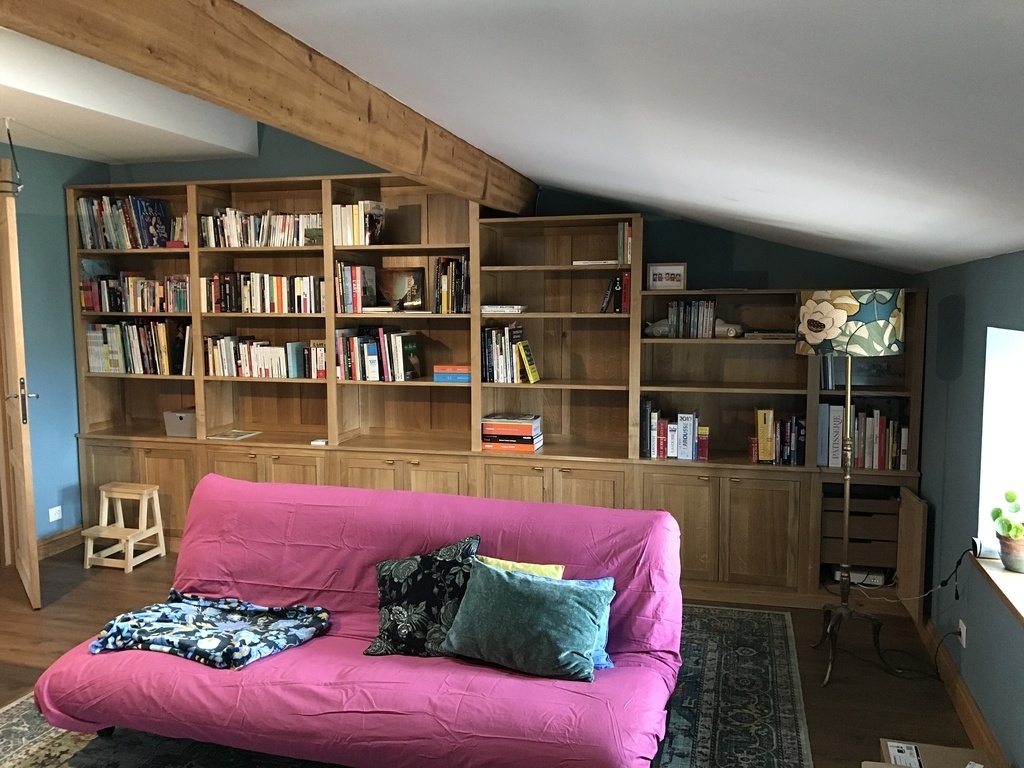 Il s'agit d'une réalisation pour mon bureau, une bibliothèque en chêne massif de 4,80 m de long. Elle a été faite de manière traditionnelle (tenons et mortaises). Finition avec un vernis de chez Surgand.