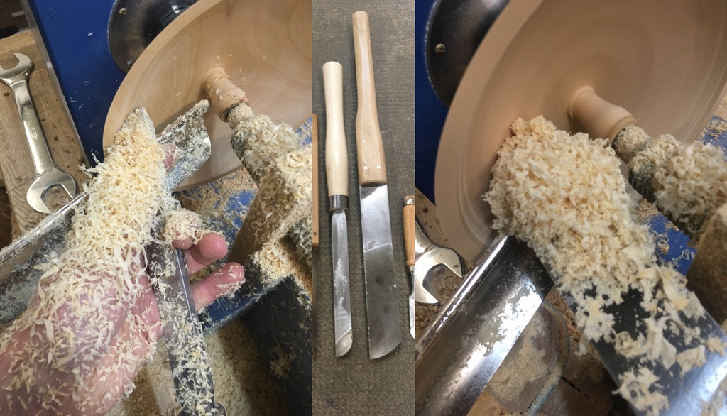 Le plus petit racloir possède un bord arrondi sur le dessous pour se manipuler de biais afin de travailler en cisaillement sur les partie en bois de bout. Le plus gros est d'avantage adapter pour les fonds des plats.