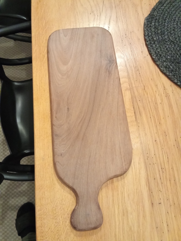 Une planche de noyer sur un meuble de récupération, délignage, rabottage, découpe à la scie à chantourner, un quart de rond à la defonceuse, deux couches d'huile minérale et en avant pour l apéritif.