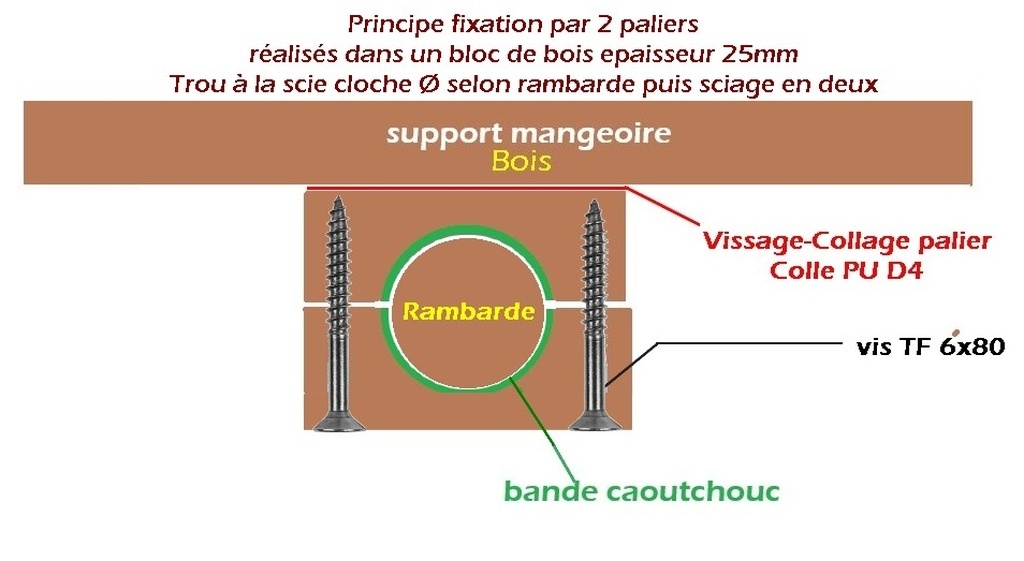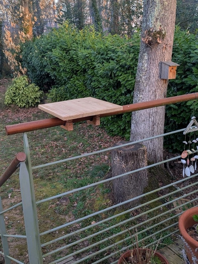 Ayant eu à poser une mangeoire sur un balcon entouré d'une rambarde bois de 43mm de Ø, j'ai fabriqué une planche de soutien fixée à la rambarde par deux paliers en bois.
