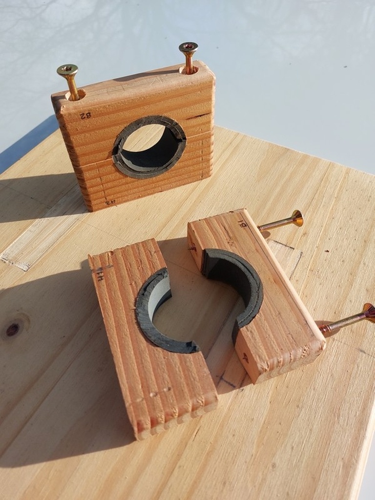 Le diamètre de la scie cloche utilisée étant de 50mm (à adapter selon Ø de la rambarde), ai ajouté deux bandes de caoutchouc pour rattraper le Ø de la rambarde et bien répartir le serrage.