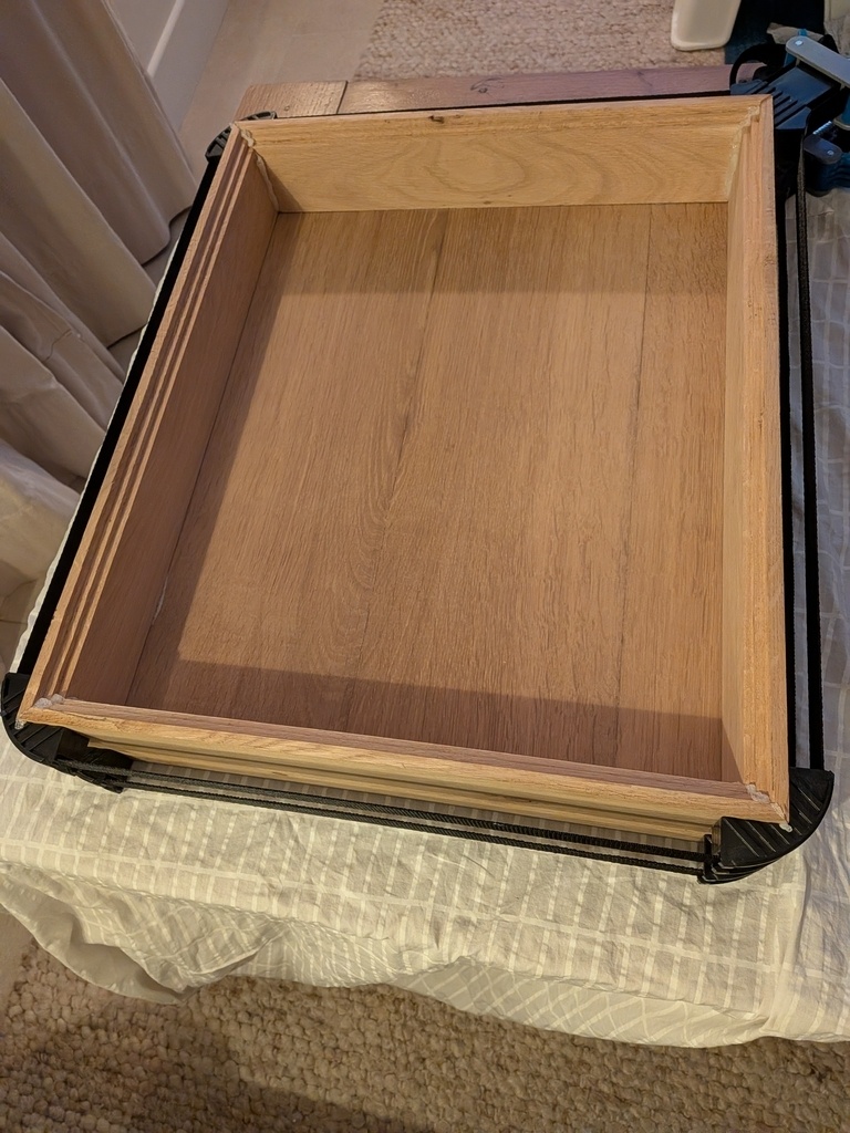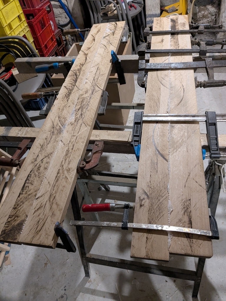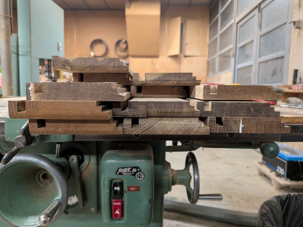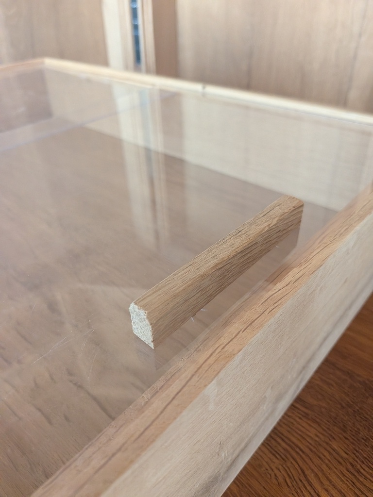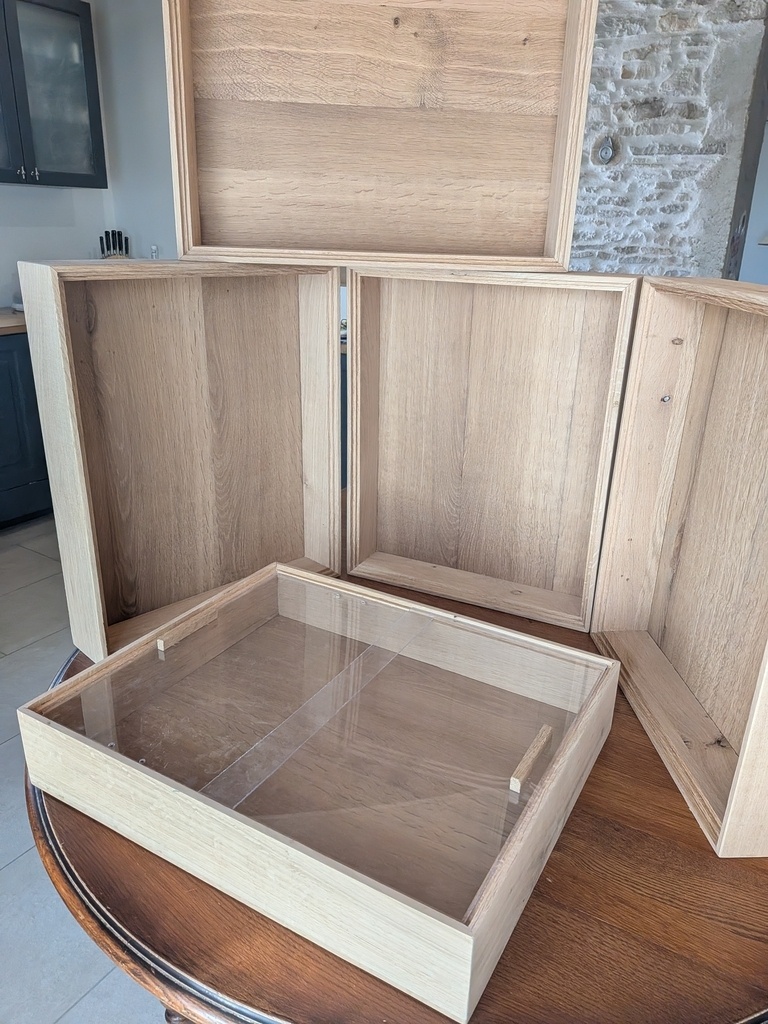 Le fond a été fait en détournant des panneaux centenaires de tête de lit, avec assemblage en rainure languette. Les boites ont été assemblées en coupe d'onglets, les feuillures et rainures faites à la scie à format. Elles reçoivent un double couvercle en Plexiglas transparent de 3mm.