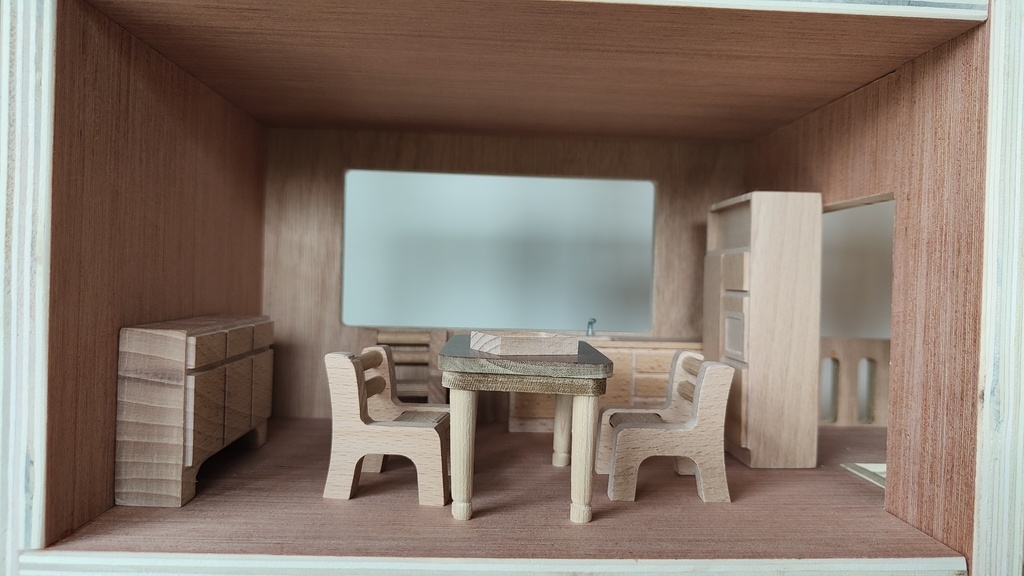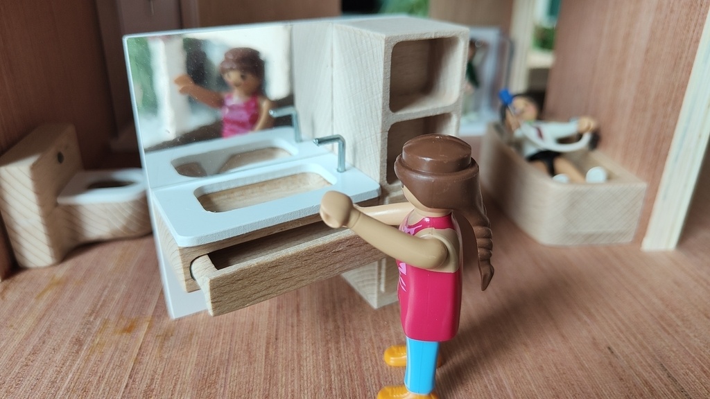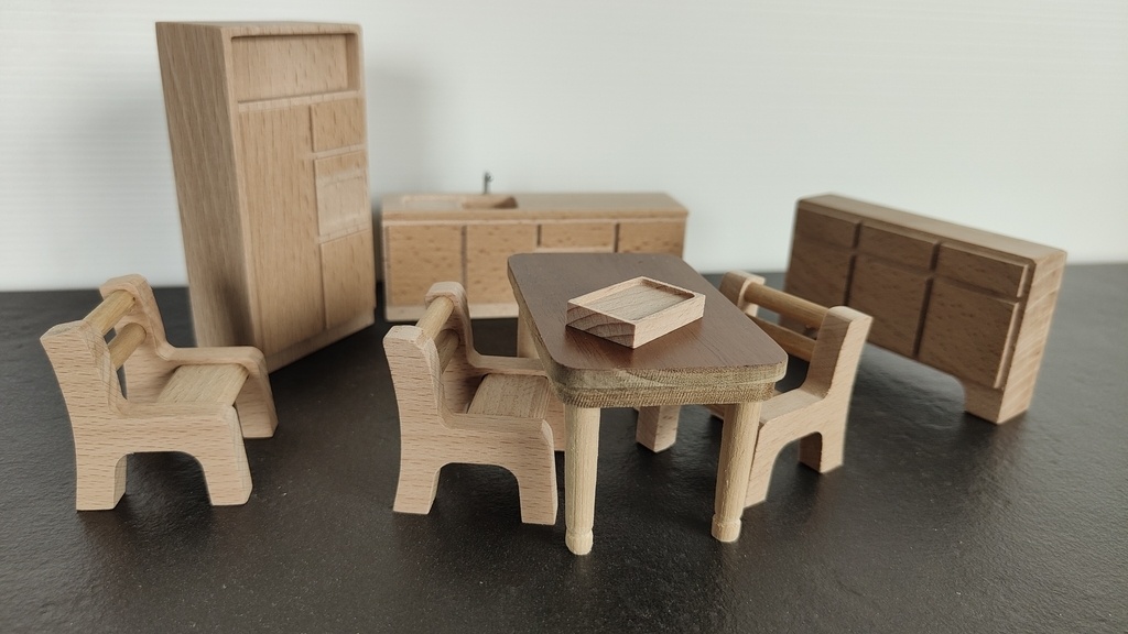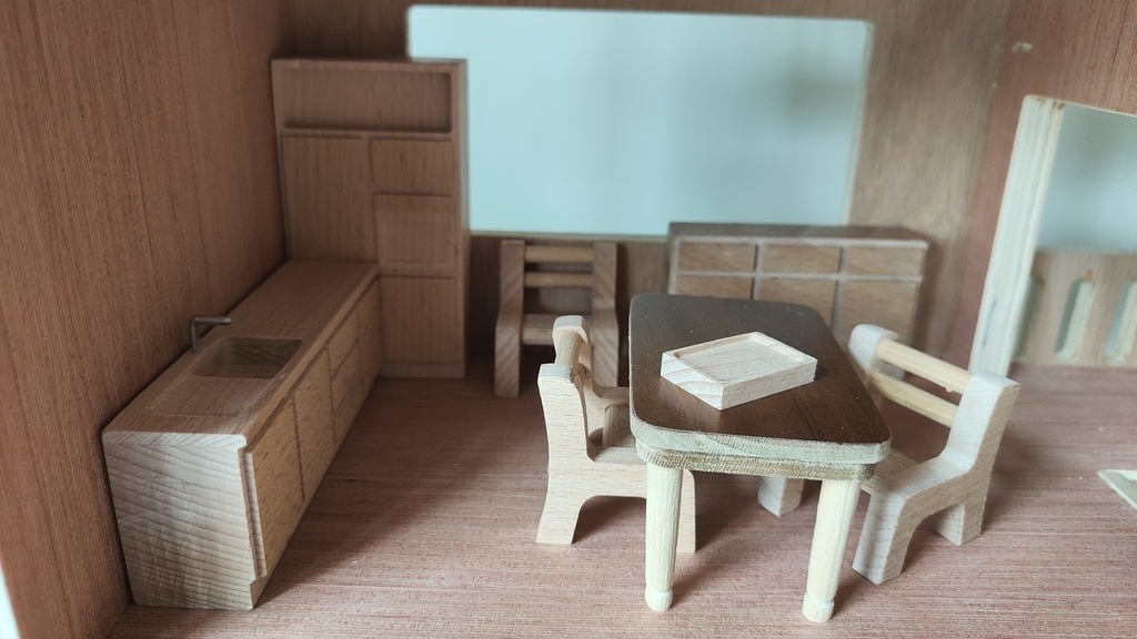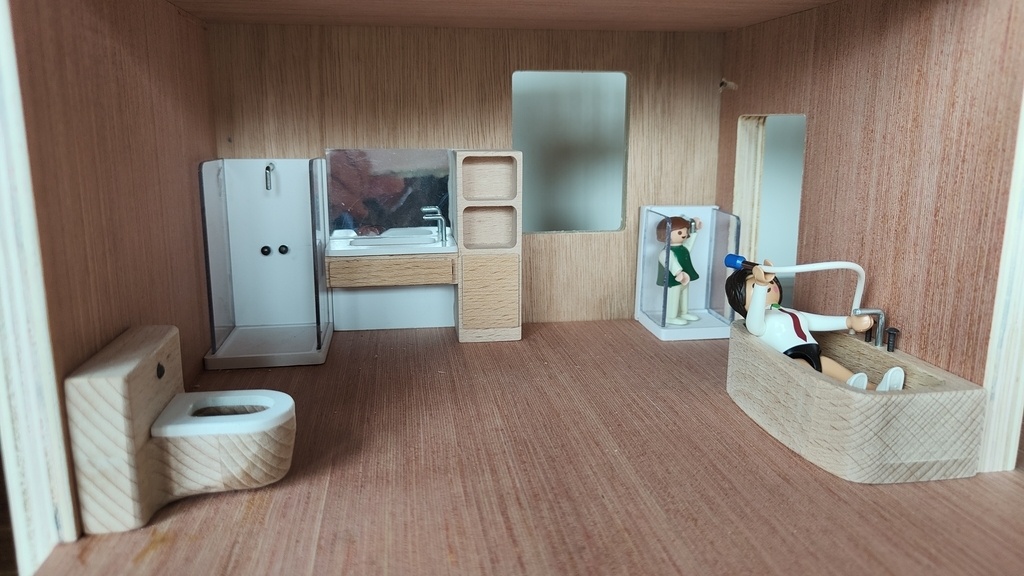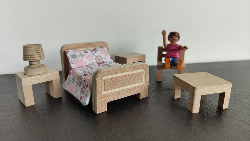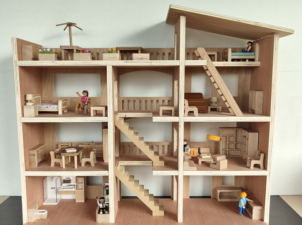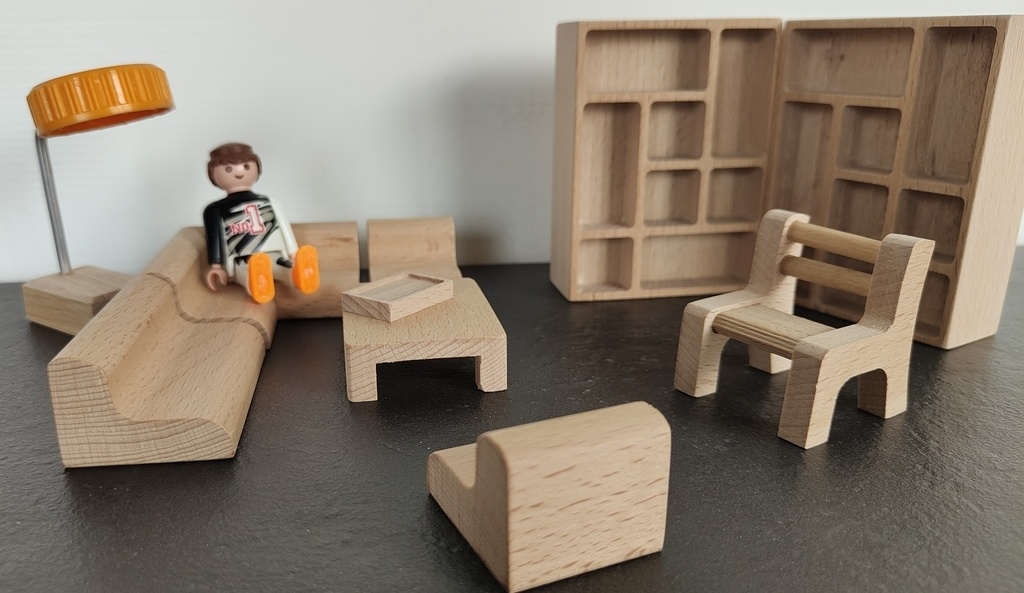 La Maison de Poupée déjà publiée, devient Maison des "Playmobils". La voilà maintenant meublée du garage à la terrasse avec chambres, cuisine, séjour et salle de bains. Ces petites créature vont désormais dormir à l'abri pour la plus grande joie de Gabrielle qui à participé aux montages des chaises, tables, bancs... et même parfois appuyé sur un bouton de la CNC pour lancer un usinage (sous le contrôle sécuritaire de papy) !