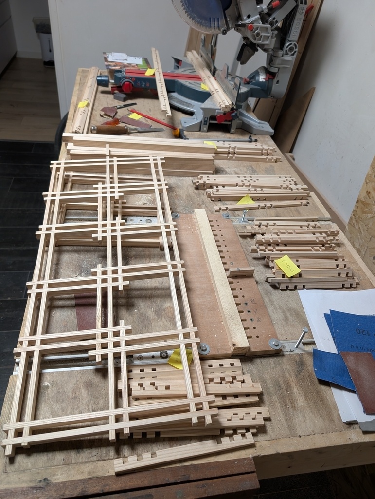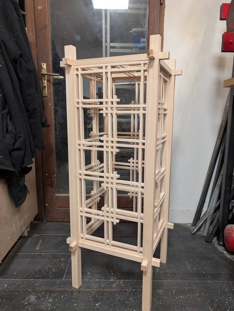 Je lui ai montré une photo de la lampe de @Séverine en lui demandant les côtes qu’elle voulait. Elle n’aura pas du tout le même format car elle souhaite une grande lampe. Elle fera 1030x410x410 j’ai dû adapter la section des « kumikos », à 16x8mm pour conserver l’esthétique du modèle. Et de ce fait, la façon de les usiner…