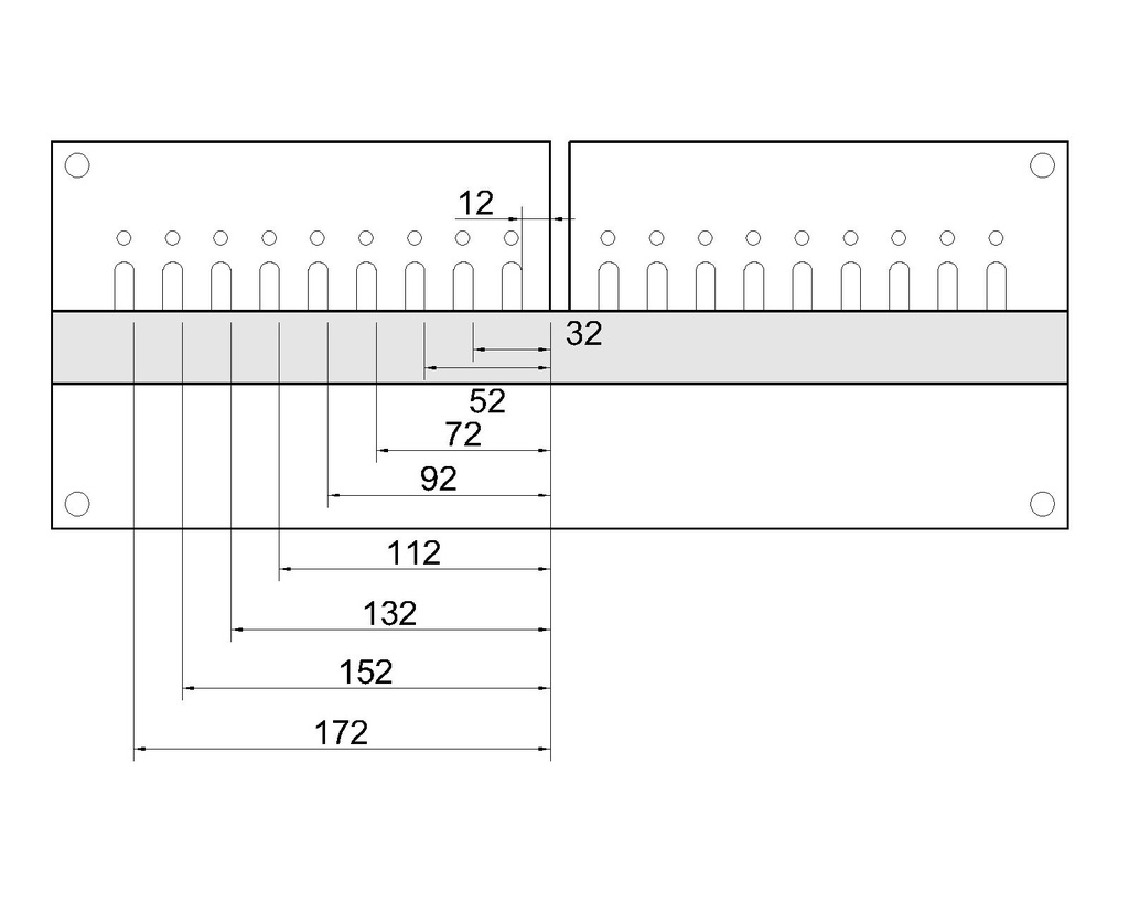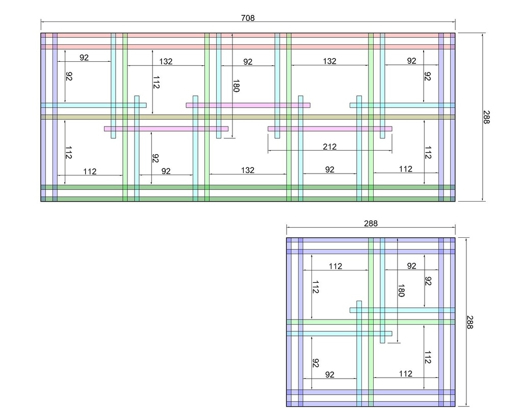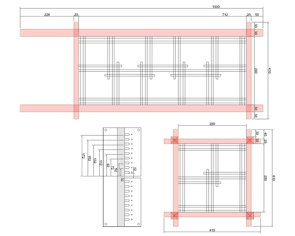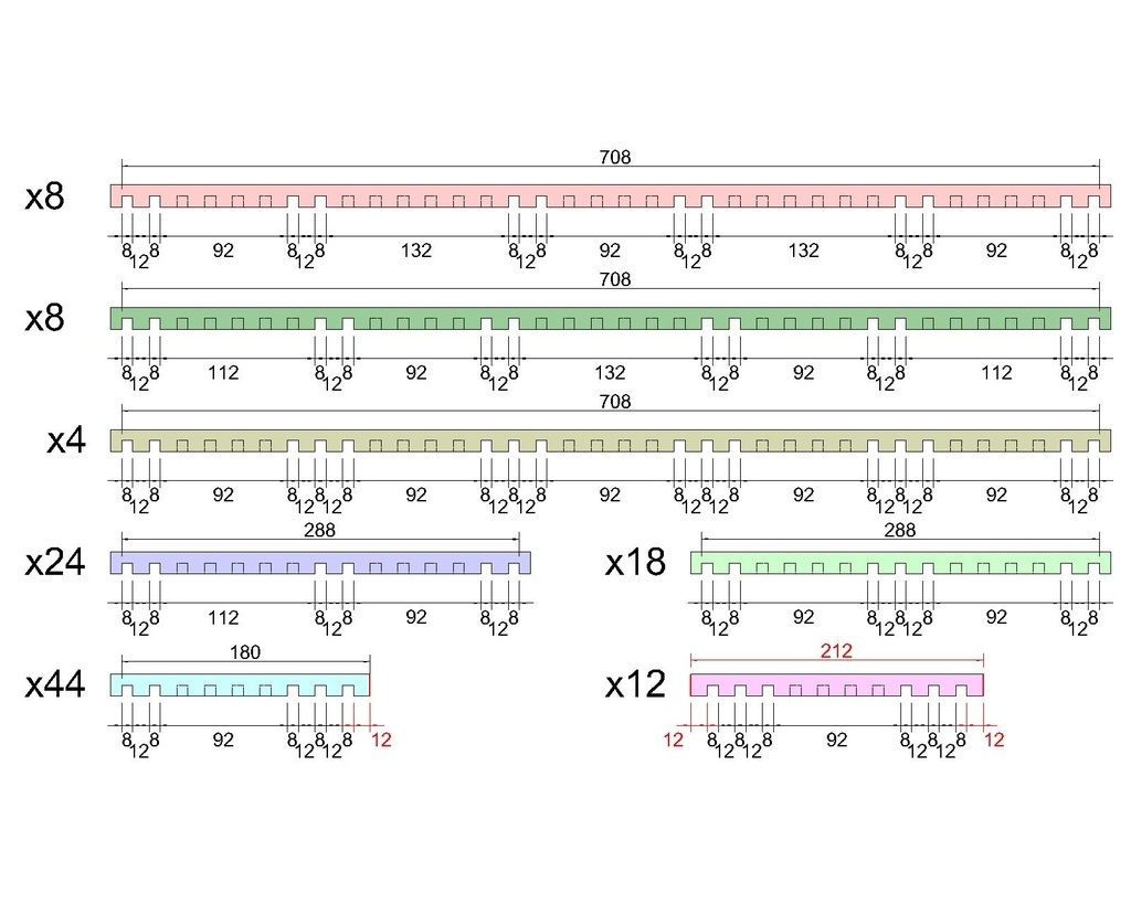 Les entailles de 8x8mm sont faites avec la défonceuse sous table à l’aide d’un gabarit (la création du gabarit c’est fait en même temps que les plans). On peut faire une entaille à 12,32,52,72,92,112,132,152,172 de l’entaille précédente.