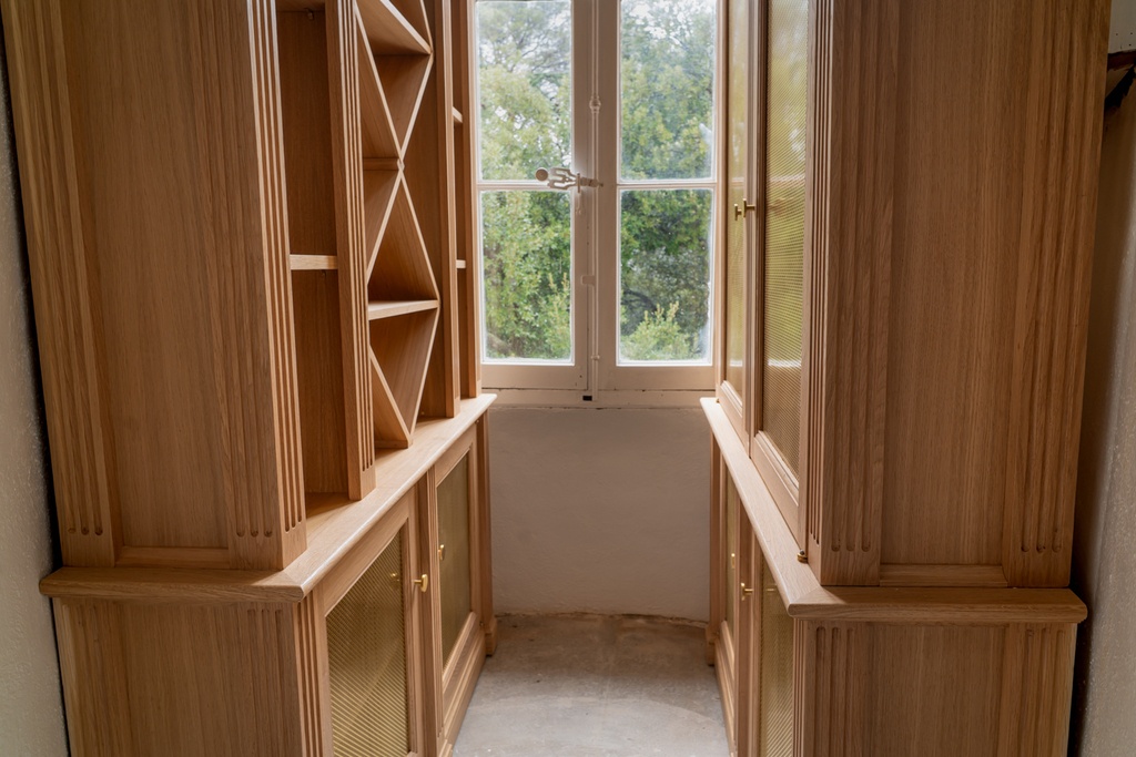 La demande consistait à meubler la pièce circulaire d'une tour d'un diamètre d'1m60 d'un châteaux qui date du 17ème.