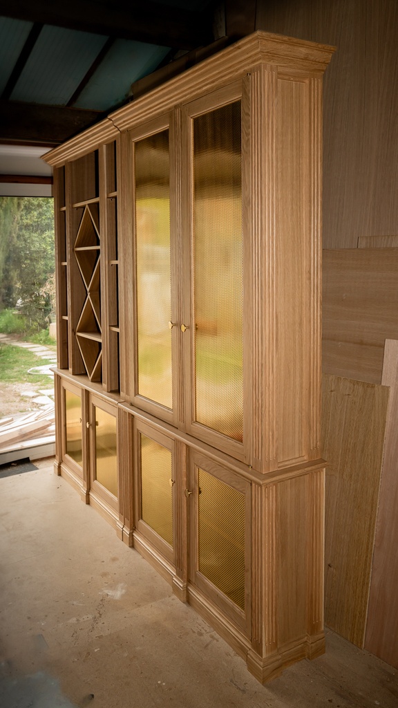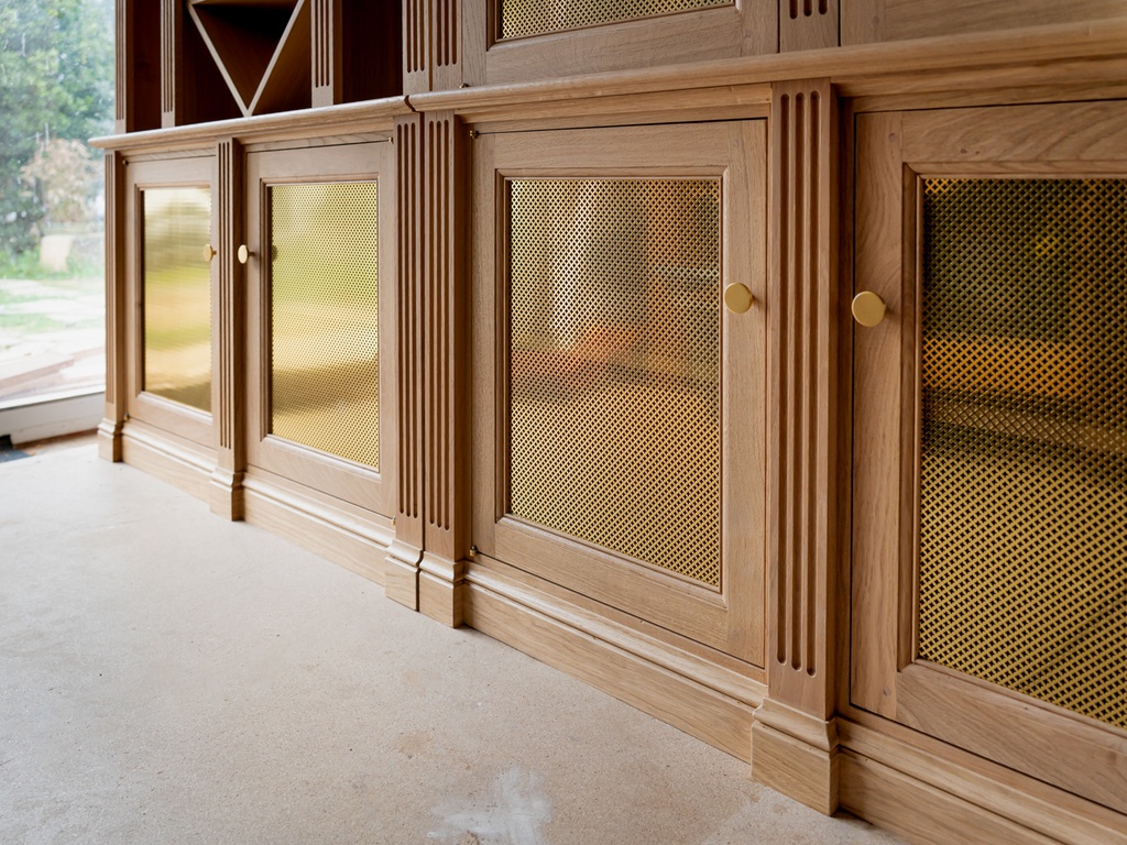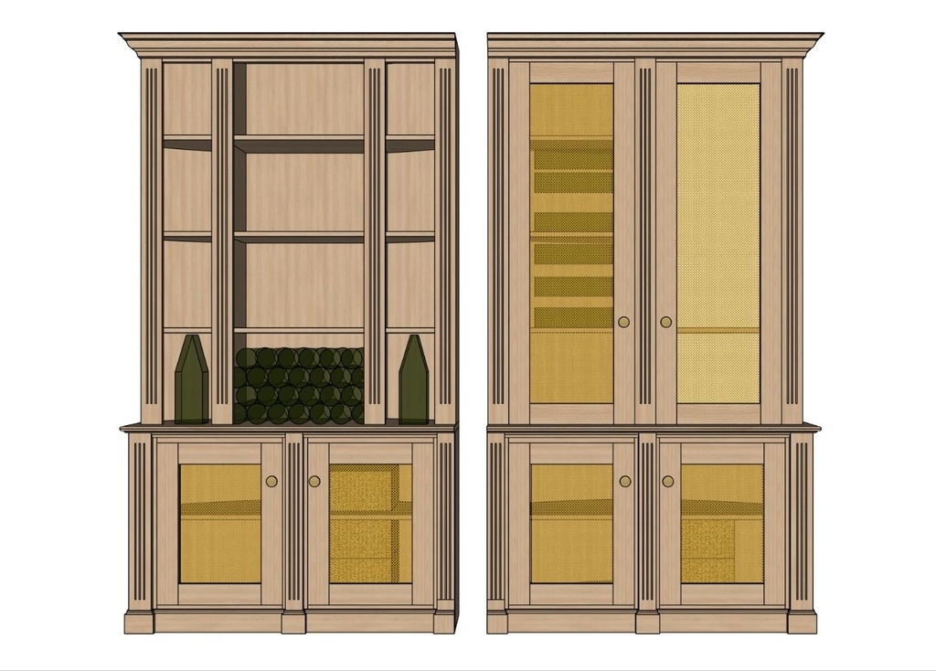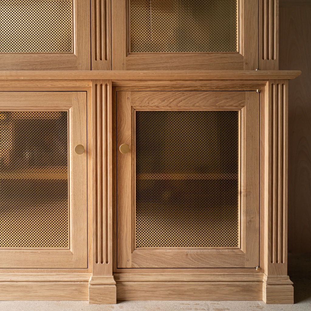 Un petit duo de bibliothèque à vin en chêne et grille laiton vernis.
