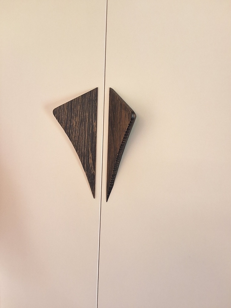 Les poignées maison en chêne massif sont ebonisees, brossées et huilées avec de l’Osmo incolore.