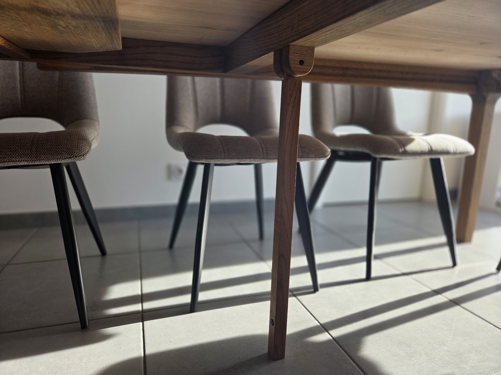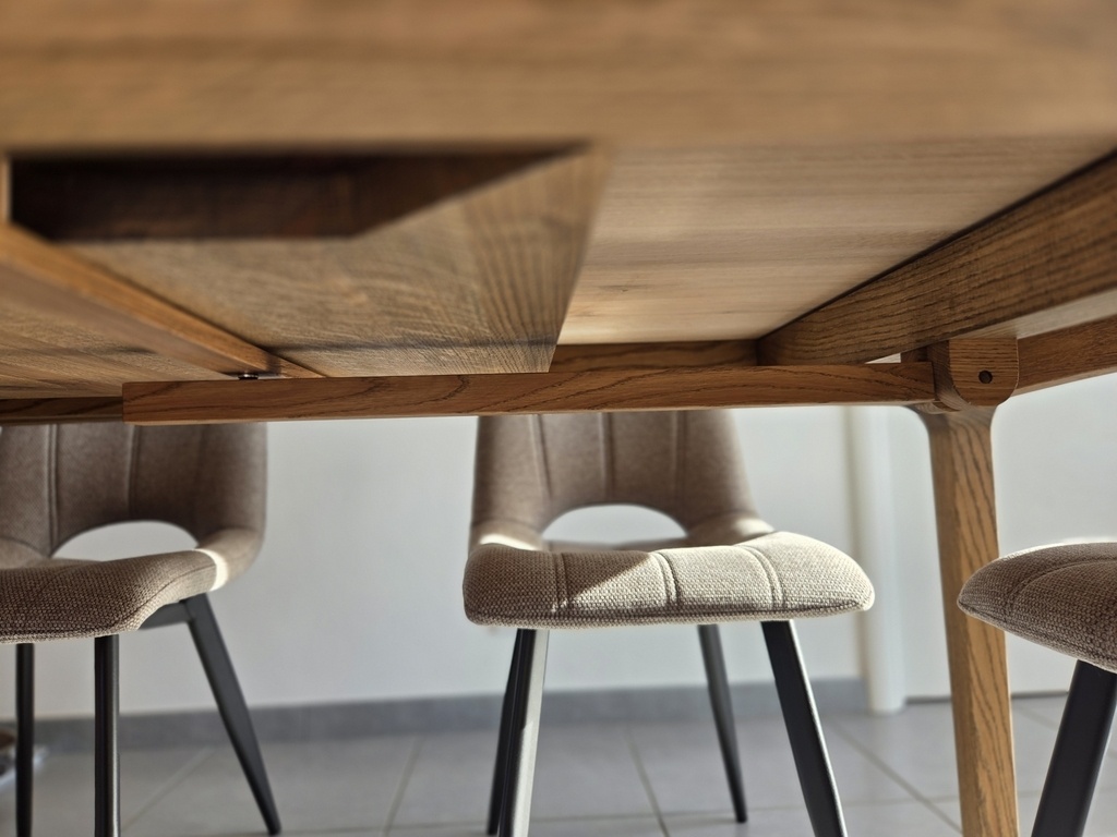 Une table en chêne de 180x100 extensible pour atteindre 3m de long.