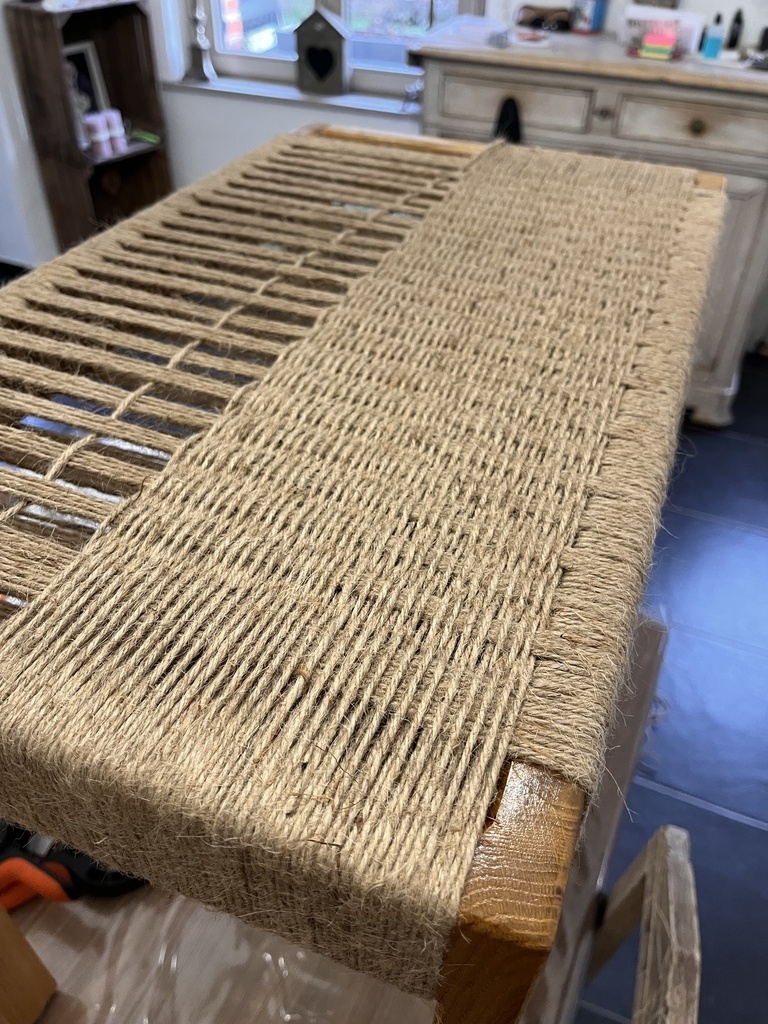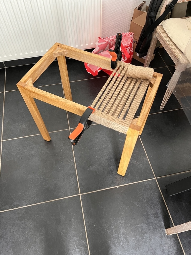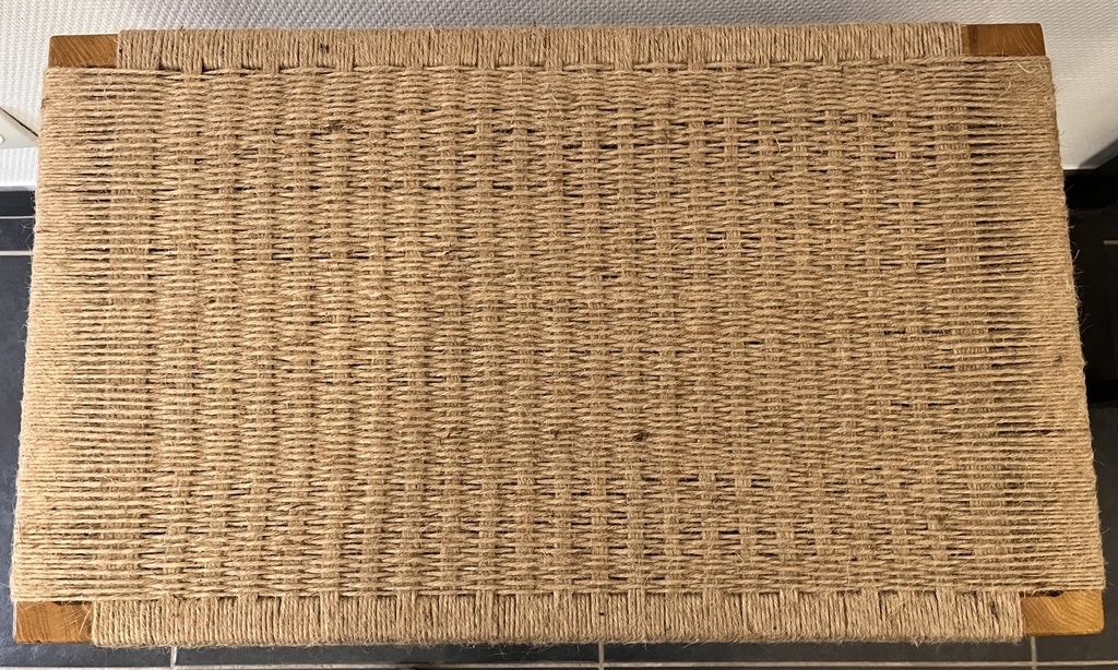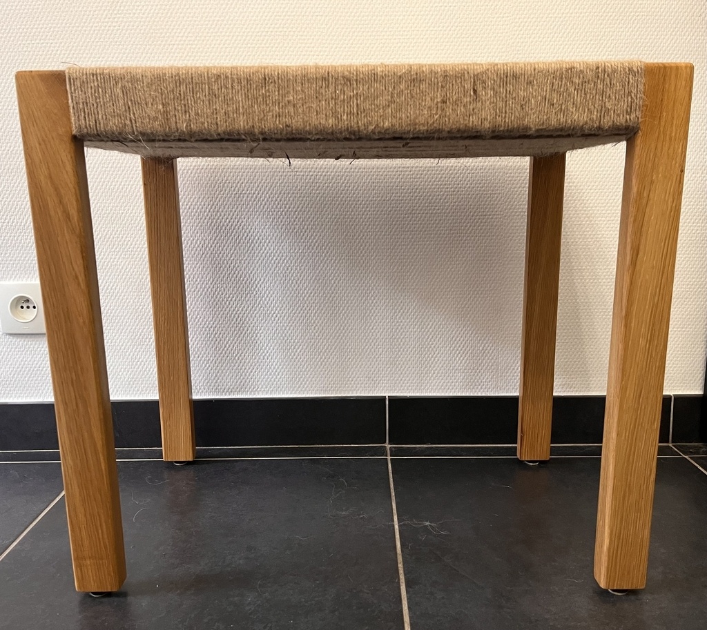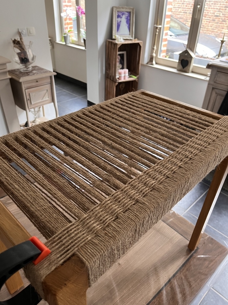Petite table d’inspiration japonaise réalisé dans des chutes et de la corde en jute.Assemblage dominos, vernis gomme laque.Rapide et efficace.