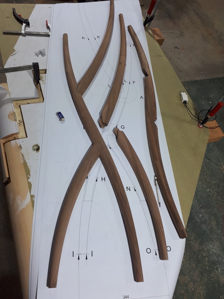 Les différentes parties évoquées sont maintenues entre elles par 2 piètements en noyer qui viennent de chaque côté de la pièce. Eux mêmes fait d'élements assemblés par tenon mortaise et façonnés avec un profil évolutif allant d’une ellipse au centre vers un cercle aux extrémités.