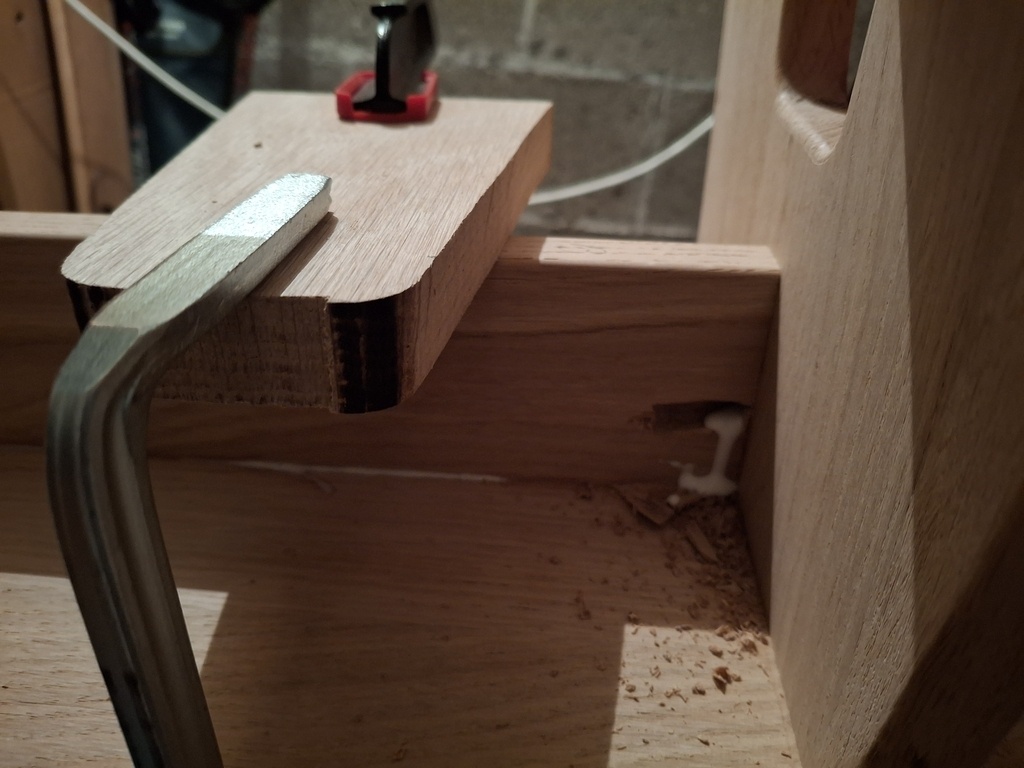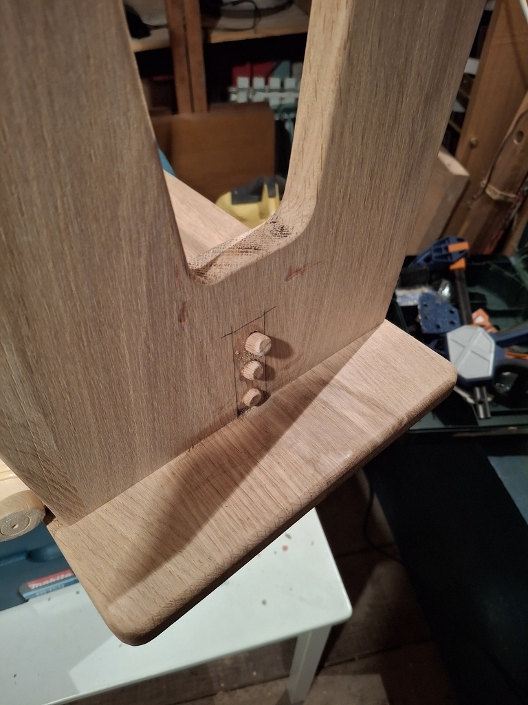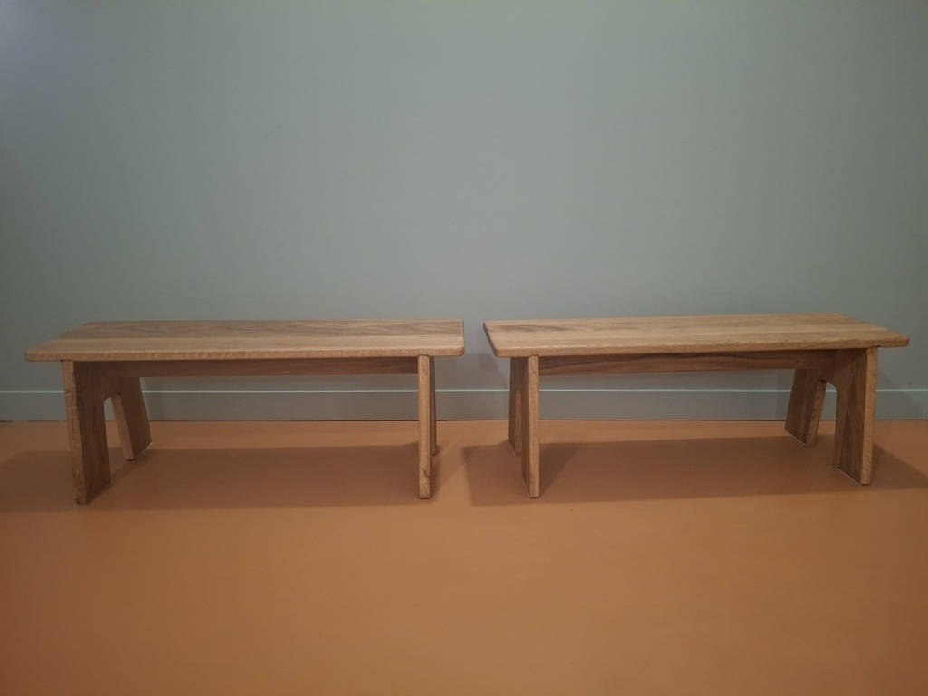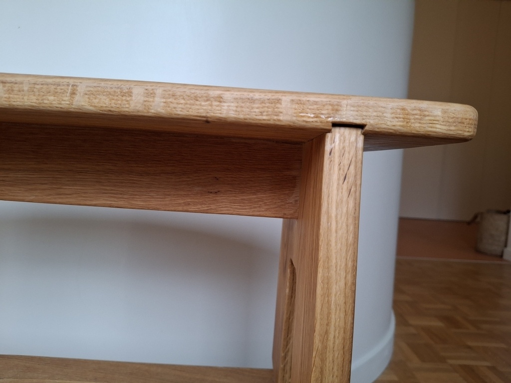 Les bancs sont réalisés en chêne acheté en GSB. J'ai voulu tenter quelque chose de nouveau et ai donc fait une rainure languette en queue d'aronde pour insérer les pieds dans le banc. Par peur de fragiliser le banc, elle ne fait que 4 mm de profondeur. La précision des assemblages est un peu aléatoire, sur certains il y avait du jeu et il y en a un pour lequel j'ai eu tellement de mal à faire rentrer le pied pour le montage à blanc que je l'ai laissée tel quel sans le coller. La traverse est collée à l'assise et maintenue aux pieds par trois tourillons traversants de chaque côté. Les tourillons sont en biais (2 vers le haut et un vers le bas) pour renforcer la stabilité. J'ai pu rattraper une erreur avec de la colle mélangée à de la sciure du ponçage.