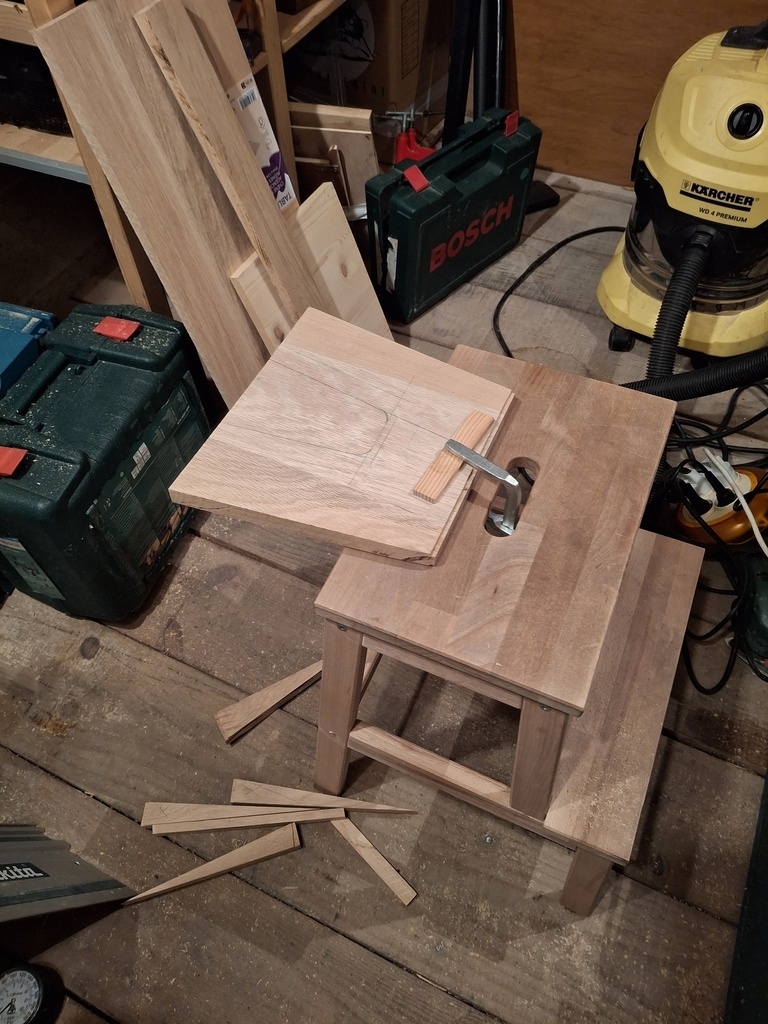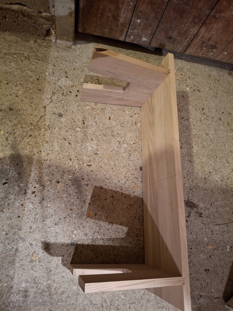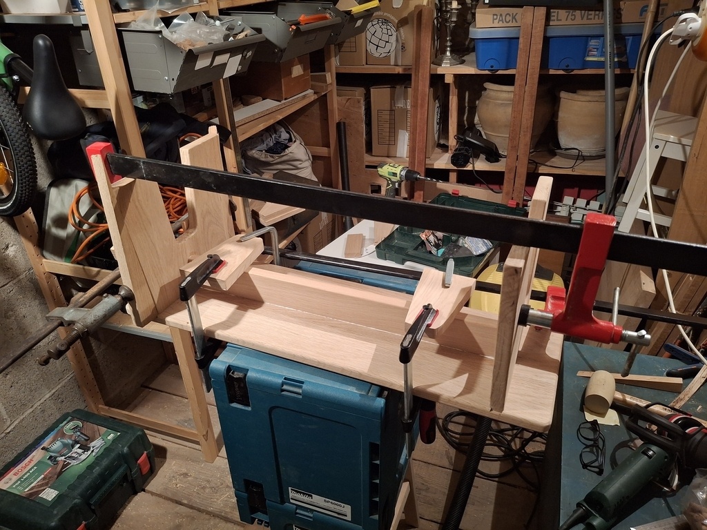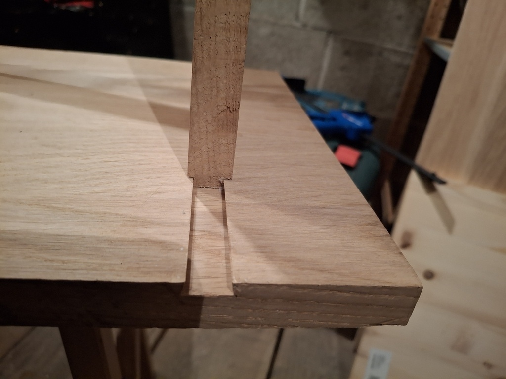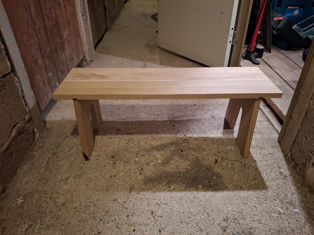 Les bancs sont réalisés en chêne acheté en GSB. J'ai voulu tenter quelque chose de nouveau et ai donc fait une rainure languette en queue d'aronde pour insérer les pieds dans le banc. Par peur de fragiliser le banc, elle ne fait que 4 mm de profondeur. La précision des assemblages est un peu aléatoire, sur certains il y avait du jeu et il y en a un pour lequel j'ai eu tellement de mal à faire rentrer le pied pour le montage à blanc que je l'ai laissée tel quel sans le coller. La traverse est collée à l'assise et maintenue aux pieds par trois tourillons traversants de chaque côté. Les tourillons sont en biais (2 vers le haut et un vers le bas) pour renforcer la stabilité. J'ai pu rattraper une erreur avec de la colle mélangée à de la sciure du ponçage.