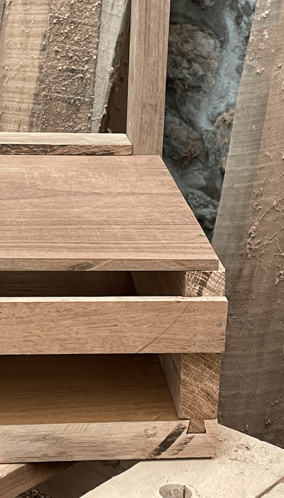 Des glissières en queue d’aronde join le caisson à tiroir, le plateau inférieur et ses pieds.