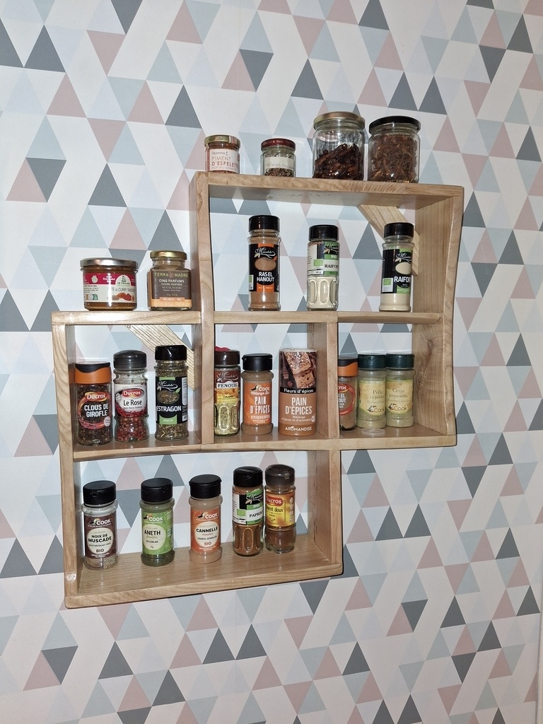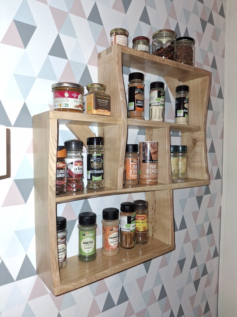 une demande de ma mère pour attraper ses épices sans ramper sous le meuble d'angle de la cuisine, inspiré par l'étagère à huiles que j'avais fait pour ma propre cuisine.