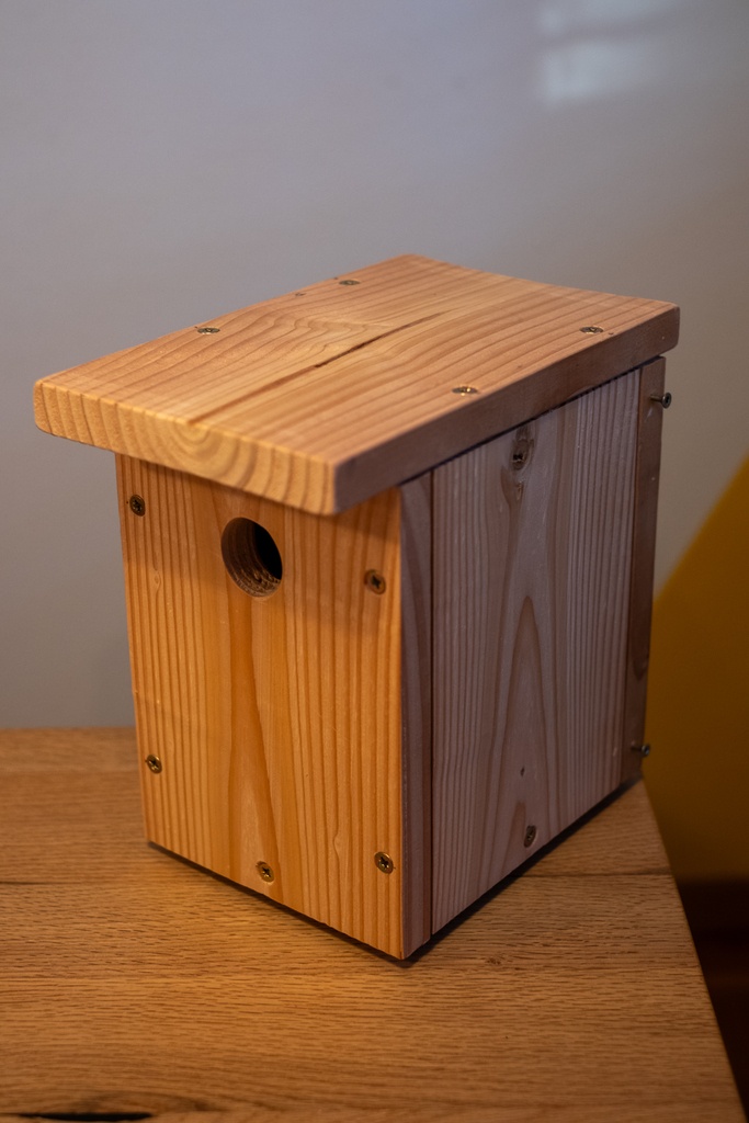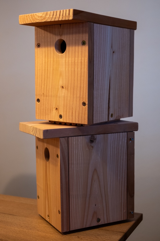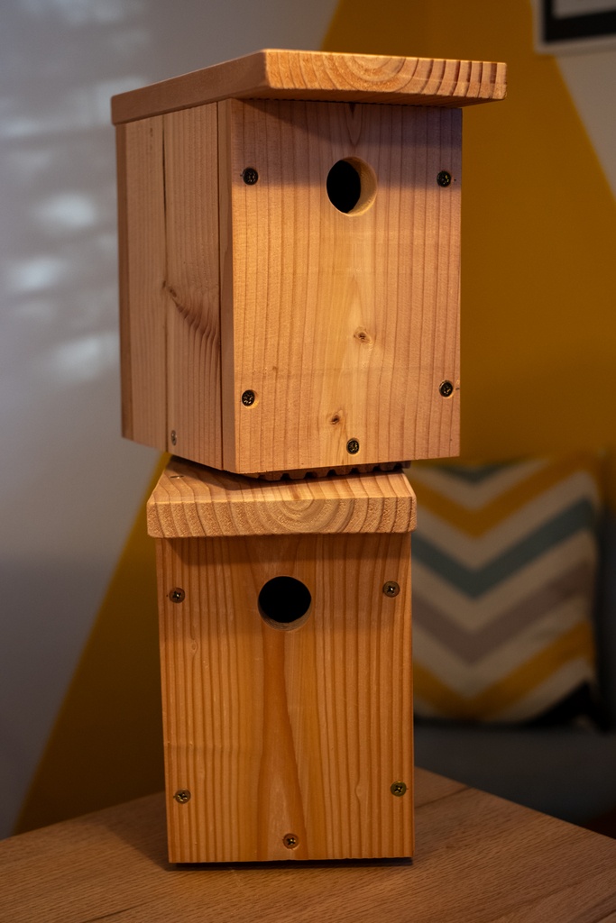 C'est la saison, je tente deux nichoirs à mésanges en douglas. J'ai un peu fait ça au tractopelle mais ça devrait faire le job !