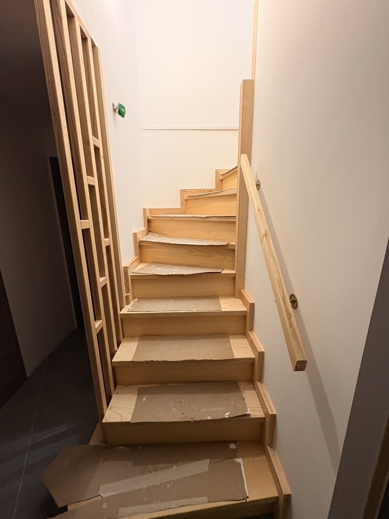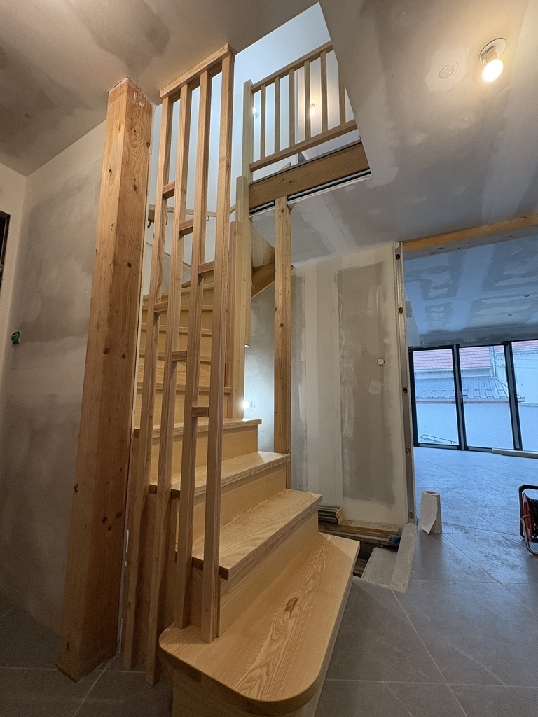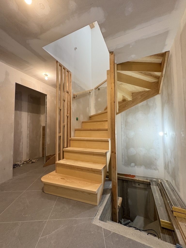 Création et fabrication d’un escalier double quart tournant sur crémaillères en frêne.