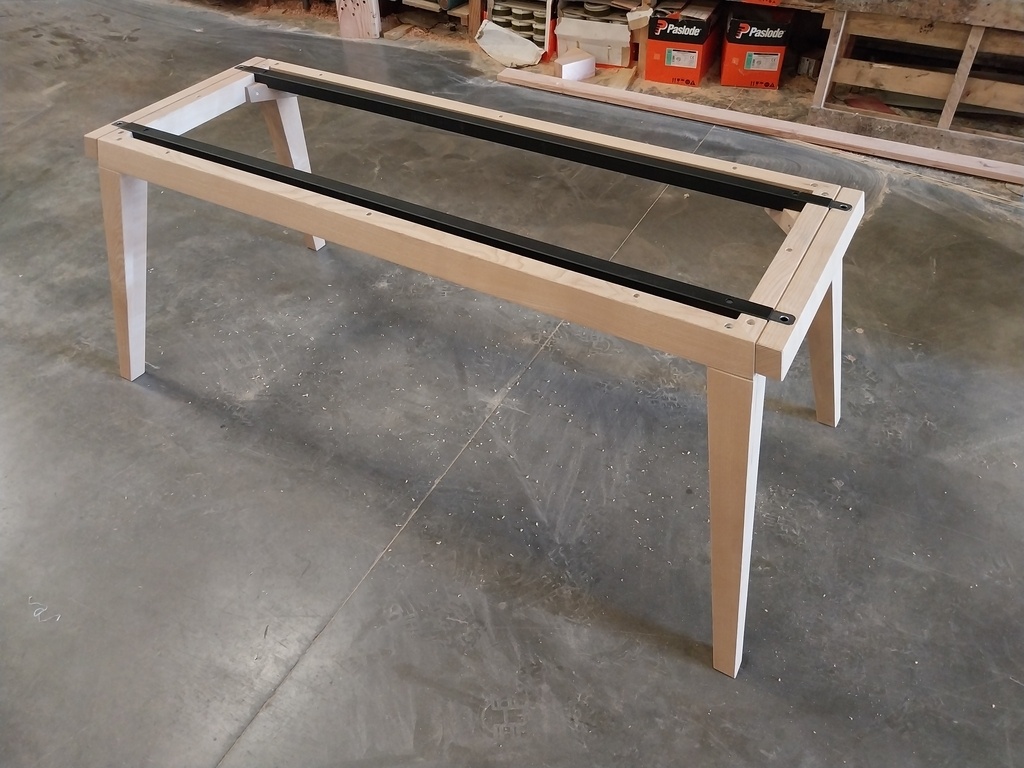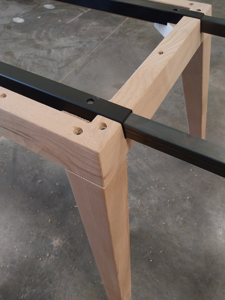 Les pieds sont positionnés sous le cadre, avec dominos pour positionnement, collage et vis en reprise des efforts (têtes de vis cachées par le plateau).