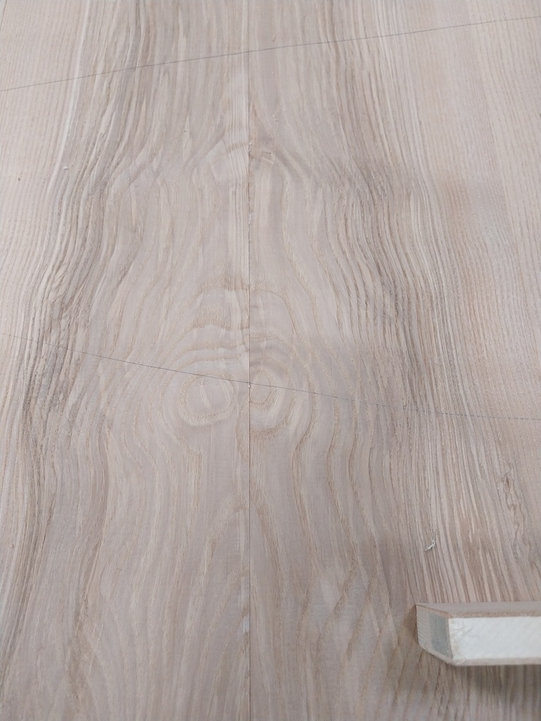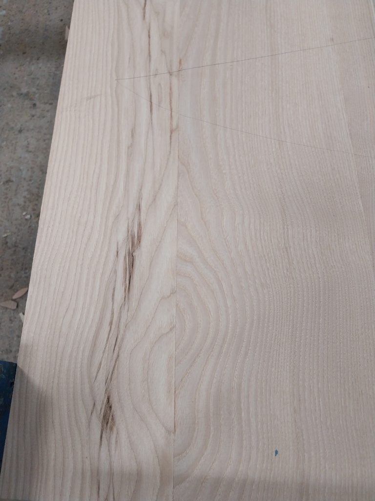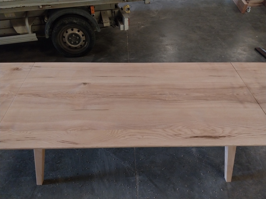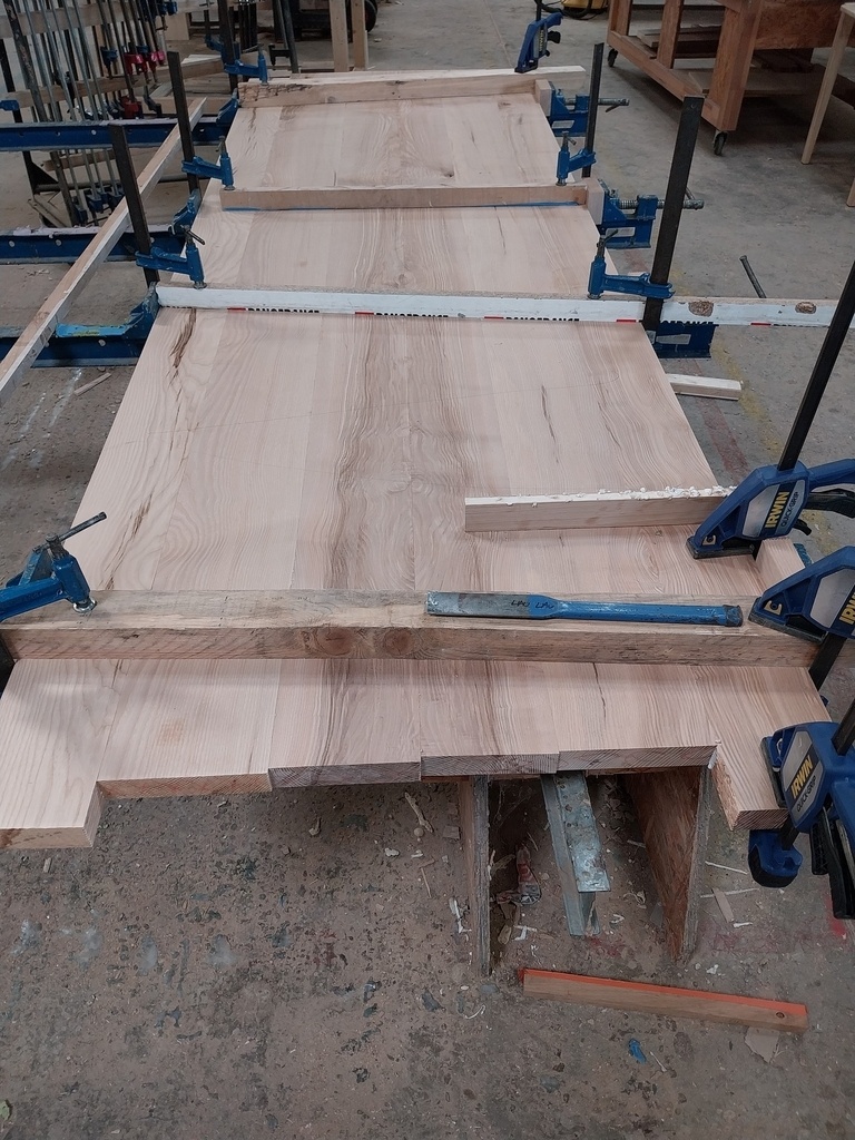 Dégauchissage, rabotage, établissement des bois et collage du plateau. Assemblage par enture "zigzag" réalisé à la toupie.