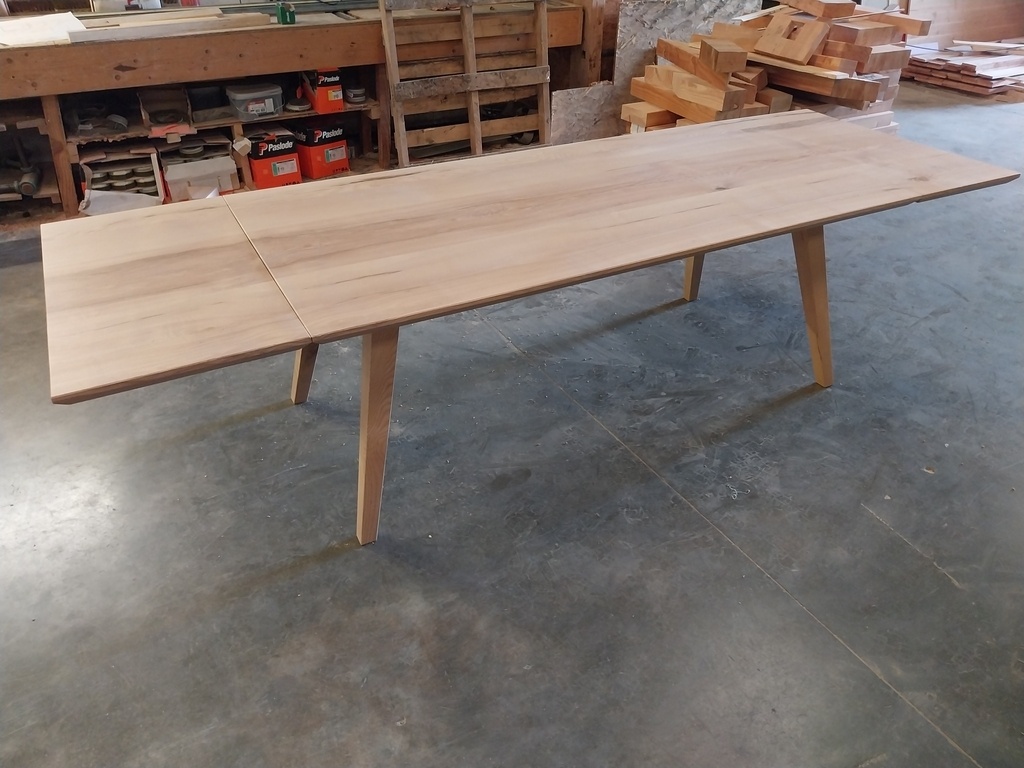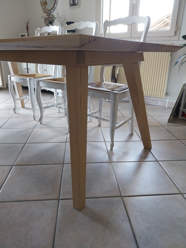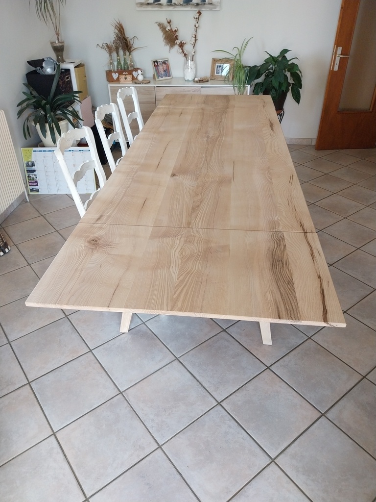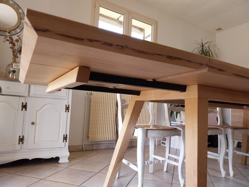 Table réalisée il y a plus d'un an, sans déformation du plateau massif, pas plus que des rallonges qui ne sont pas stockées dans la même pièce que la table. Je craignais que l'on me rapporte des variations dimensionnelles dues aux hygrométries différentes selon les pièces (rallonges dans pièce adjacente mais rarement chauffée), mais aux dernières nouvelles tout se comporte pour le mieux.