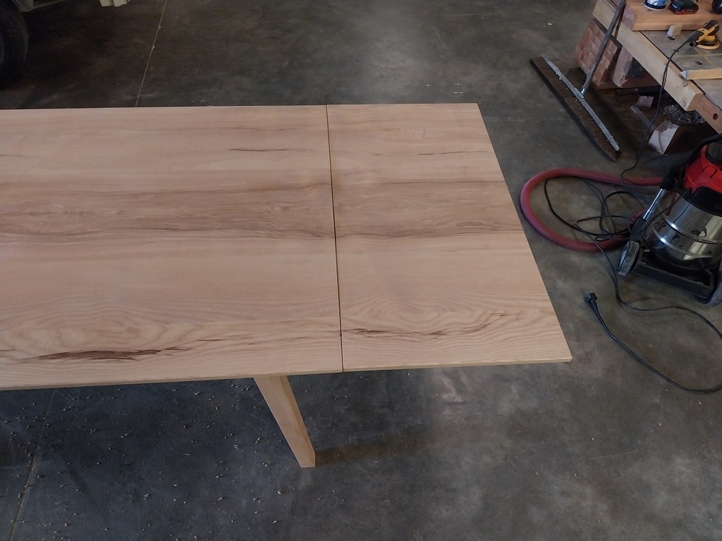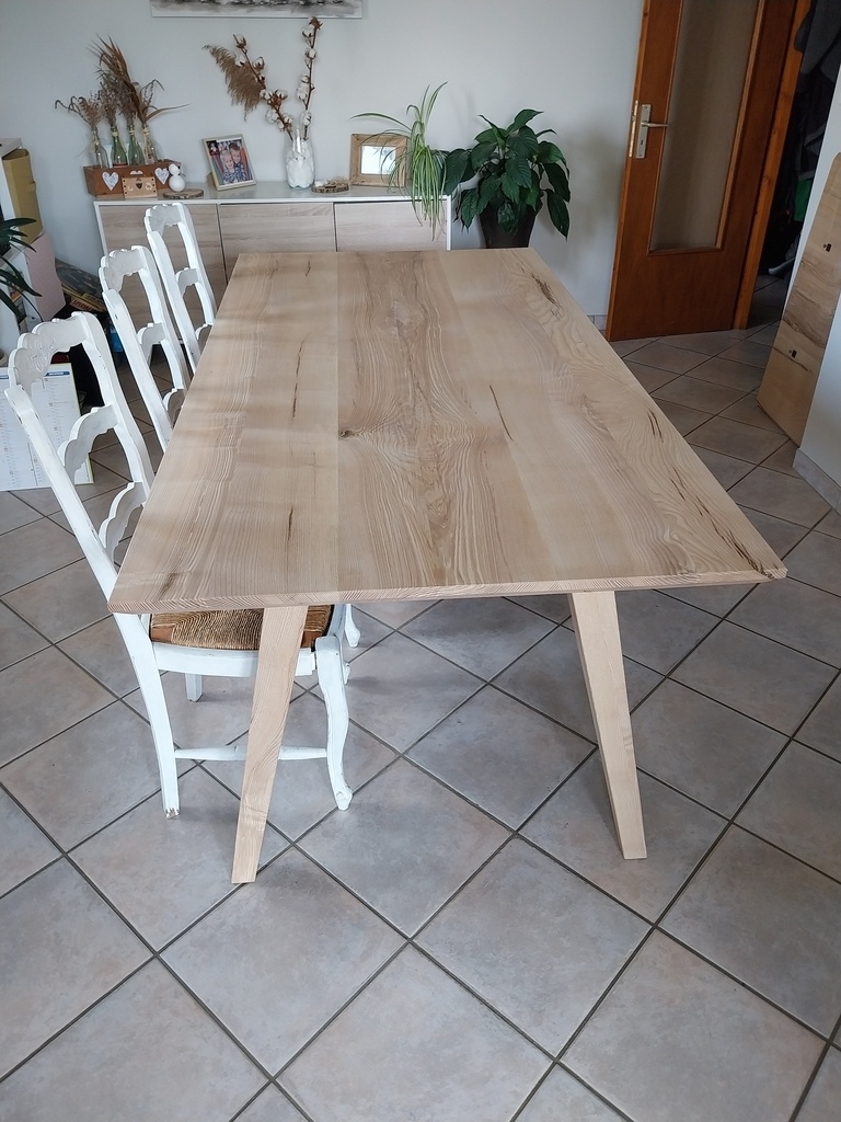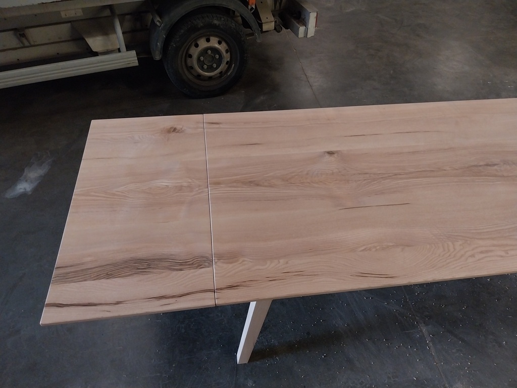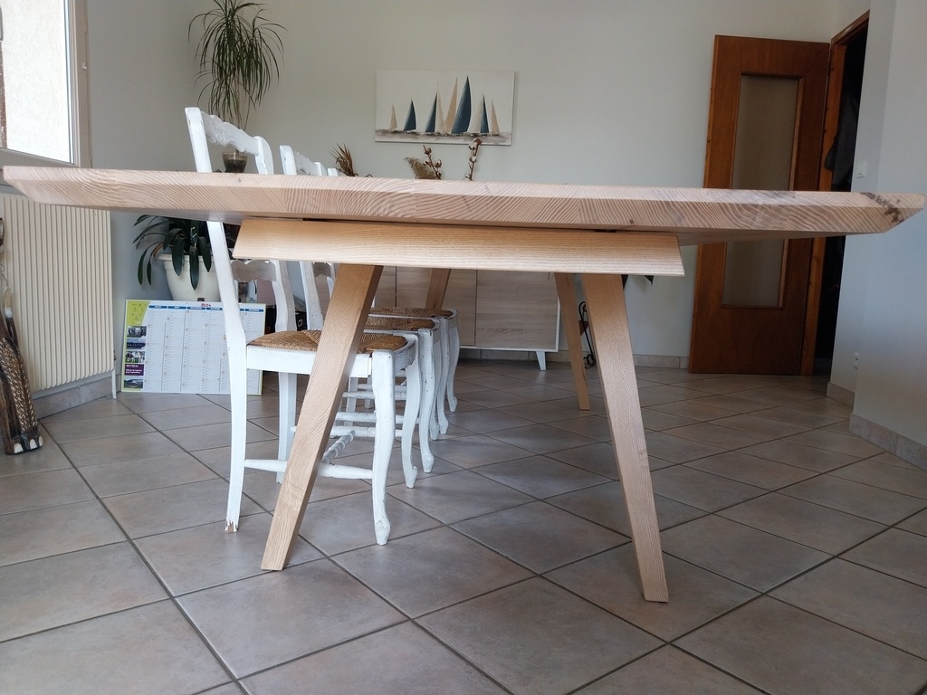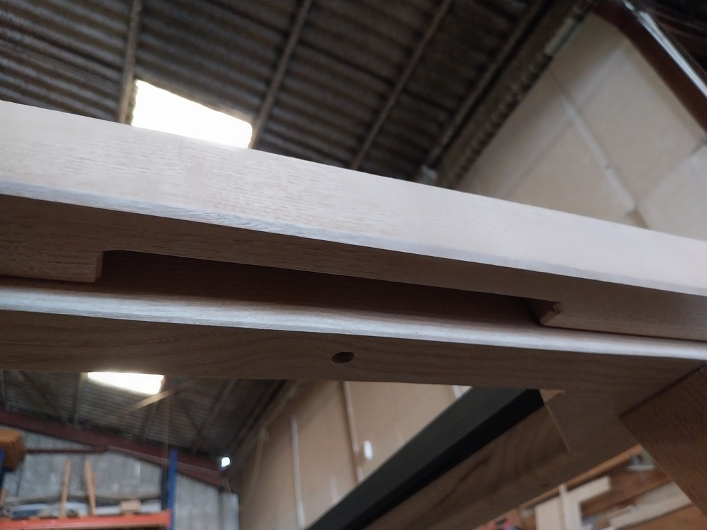 Table réalisée il y a plus d'un an, sans déformation du plateau massif, pas plus que des rallonges qui ne sont pas stockées dans la même pièce que la table. Je craignais que l'on me rapporte des variations dimensionnelles dues aux hygrométries différentes selon les pièces (rallonges dans pièce adjacente mais rarement chauffée), mais aux dernières nouvelles tout se comporte pour le mieux.