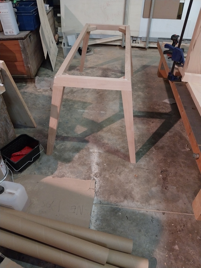 L'ensemble structure horizontale + pied est réalisé en arêtiers. Les pieds ont également un amincissement en s'affinant vers le bas façon compas.