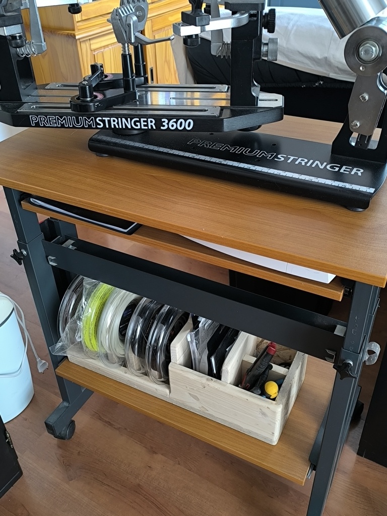 J'ai donc réalisé cette boite de rangement des bobines, petites fournitures et outils de cordage de tennis, réalisée avec des chutes d'OSB3 et de sapin en 18mm (oui c'est stabil, à défaut d'avoir du CP sous la main