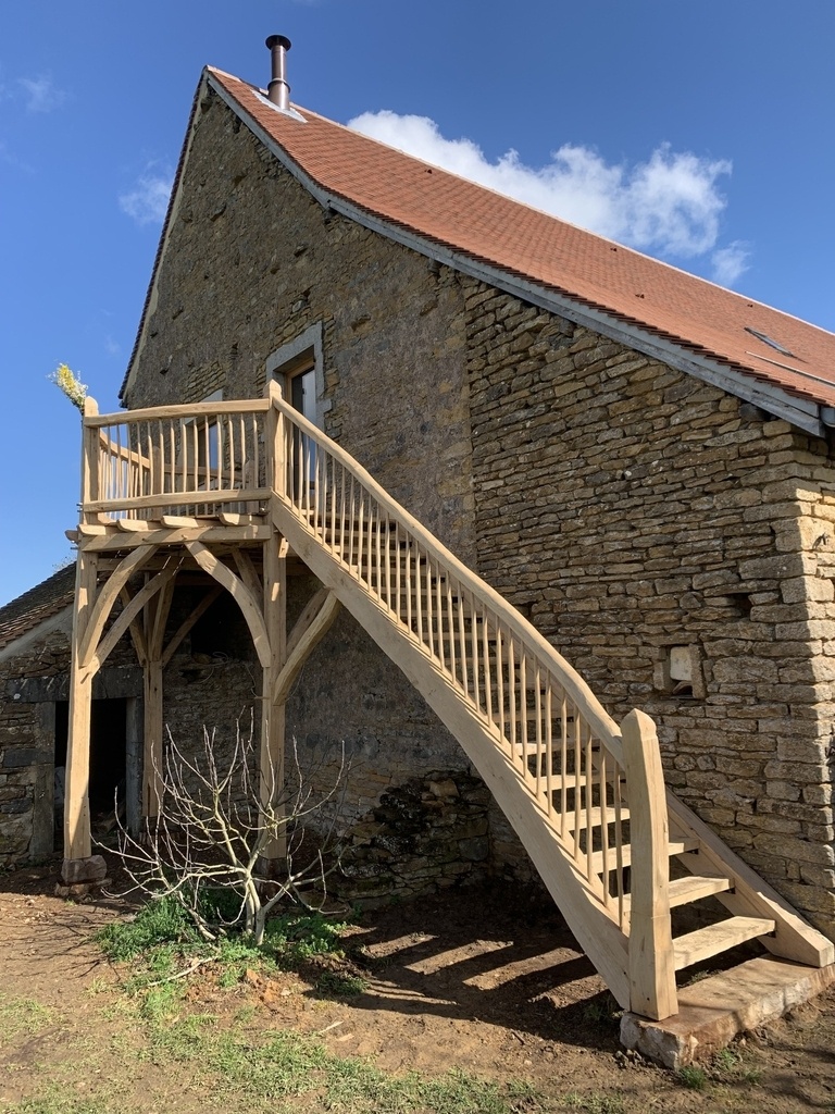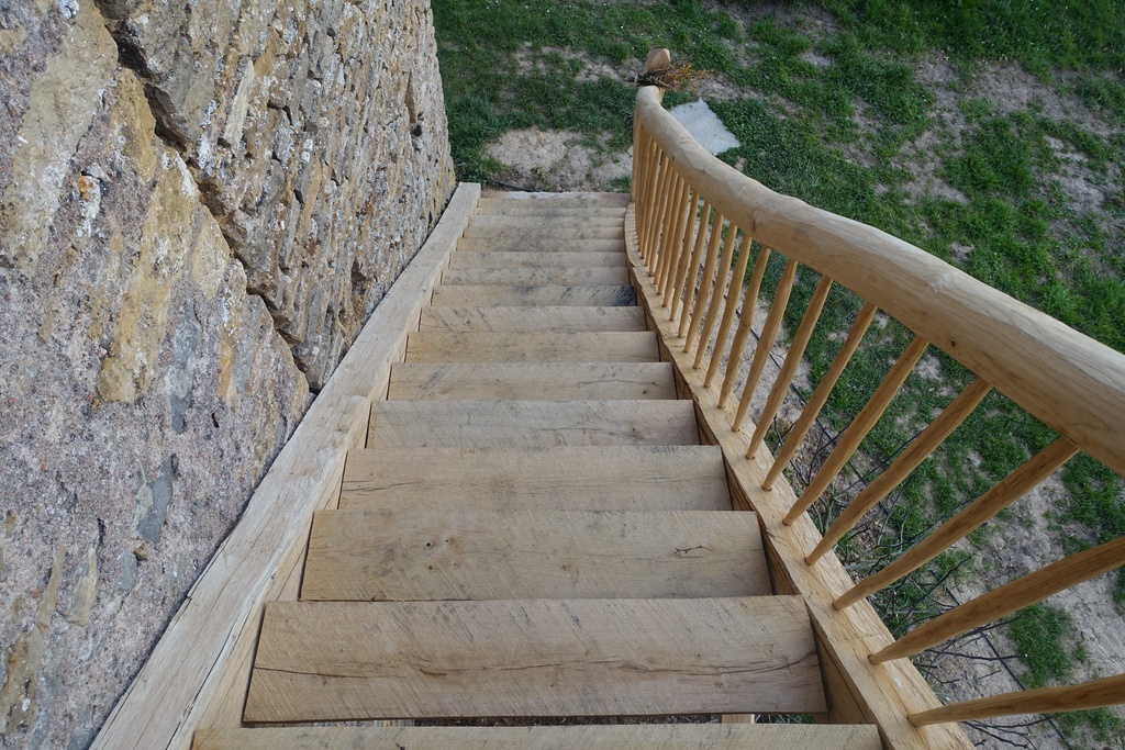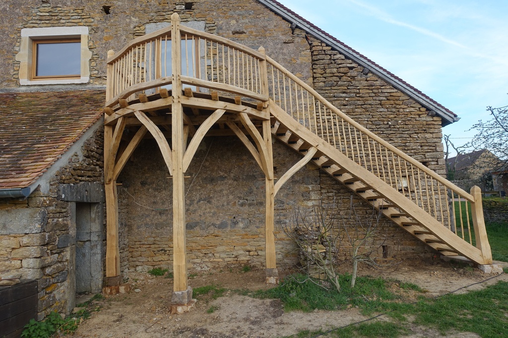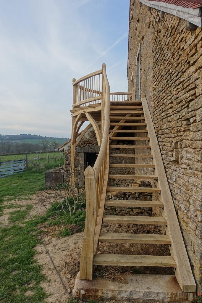 Les marches d'escalier ont été sciées de long à partir de deux grosses poutres équarries. Elles sont fixées sur des cornières métalliques pour éviter autant que possible les pièges à eau.