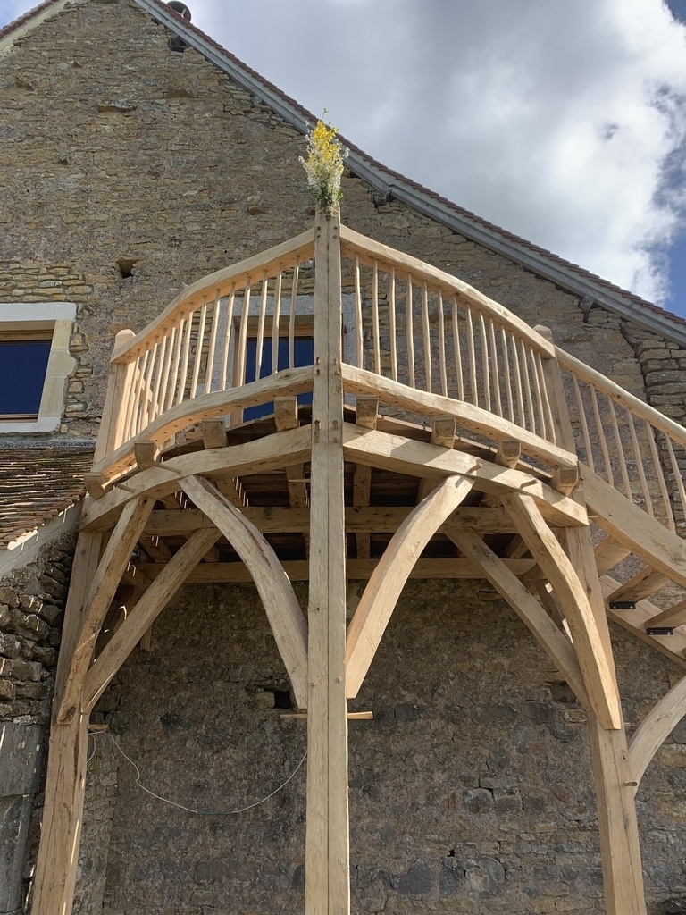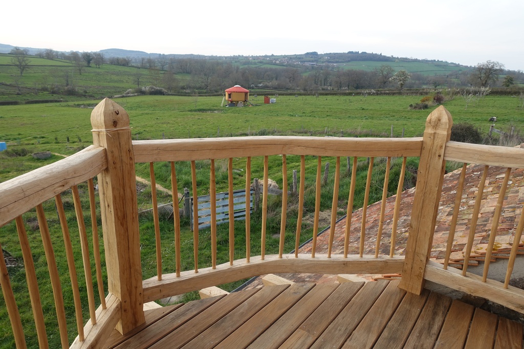L'ouvrage est malheureusement soumis aux intempéries (l'idée n'était pas de réaliser une terrasse couverte pour les clients), mais les bois sont tous classe 3b : principalement du chêne, un peu de châtaignier pour les barreaux et la main courante et de l'Ipé de réemploi pour les lames de terrasse (issues d’une terrasse démontée).