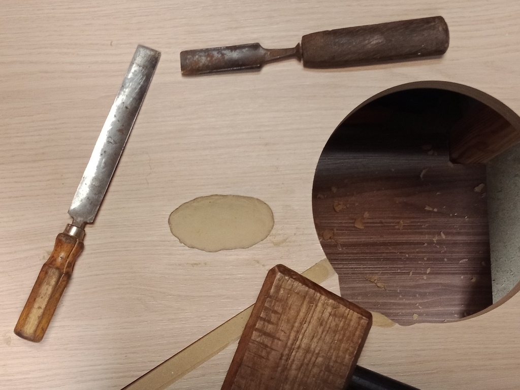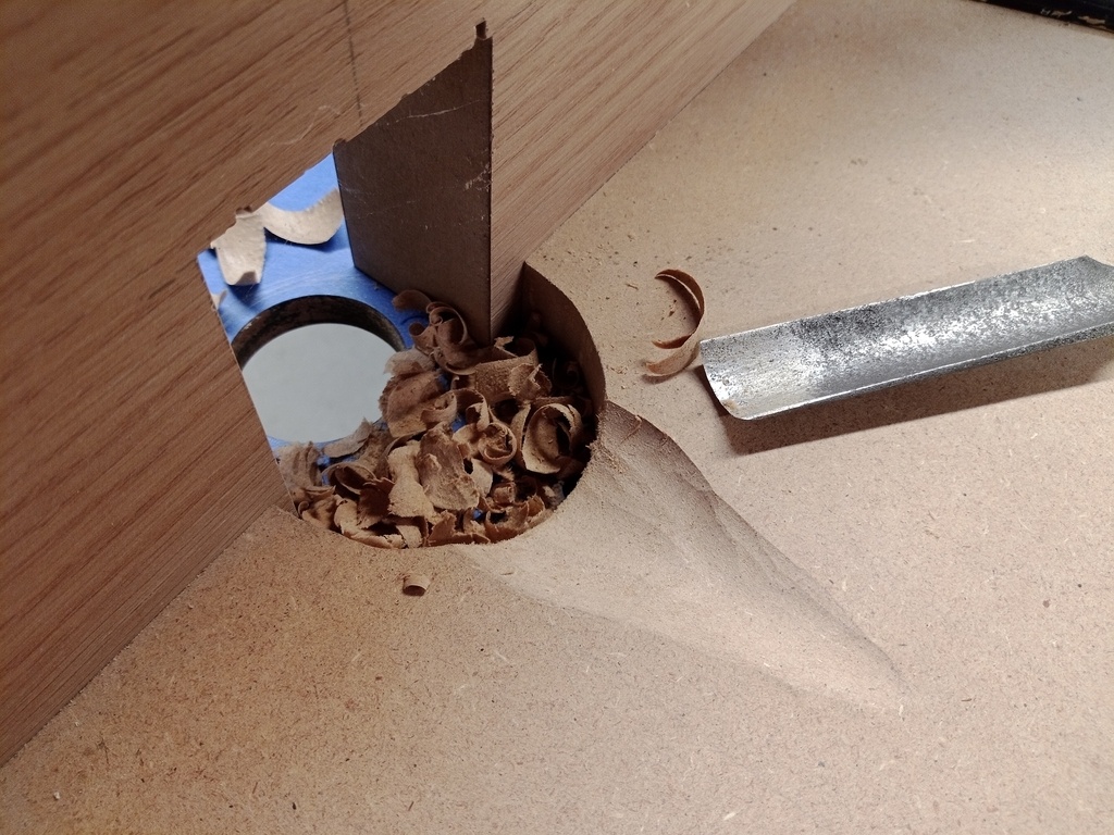 Je finis les angles, adapte le cercle débouchant au système d'aspiration de la défonceuse et creuse un peu le plateau à la gouge. En effet, le plateau est très épais et la poignée empêchait la défonceuse de sortir jusqu'au bout. Dur moment pour les gouges...
