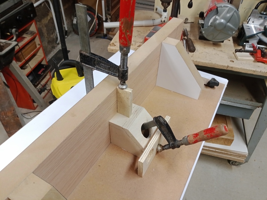 Le jour, l'ouverture sur la face est faite à la scie à onglets avec une butée de profondeur. Avec une scie sauteuse, je coupe un demi-cercle sur la pièce de dessous.