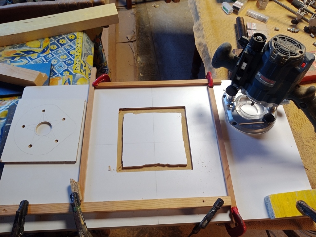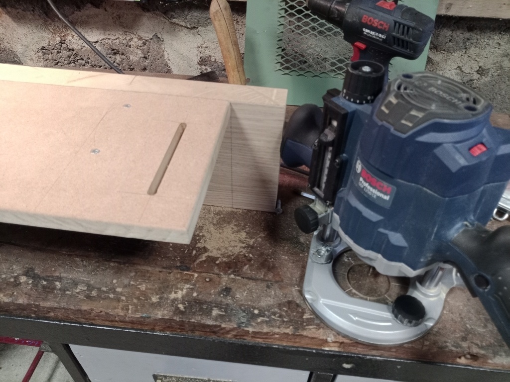 Il est mis à format avec une lame adaptée, puis chanfreiné à l'affleureuse. Ensuite, je défonce le trou central à l'aide d'un gabarit de défonceuse. Les trous de fixation sont fait à la défonceuse également et en deux fois, puisque ce sont des trous feuillurés.