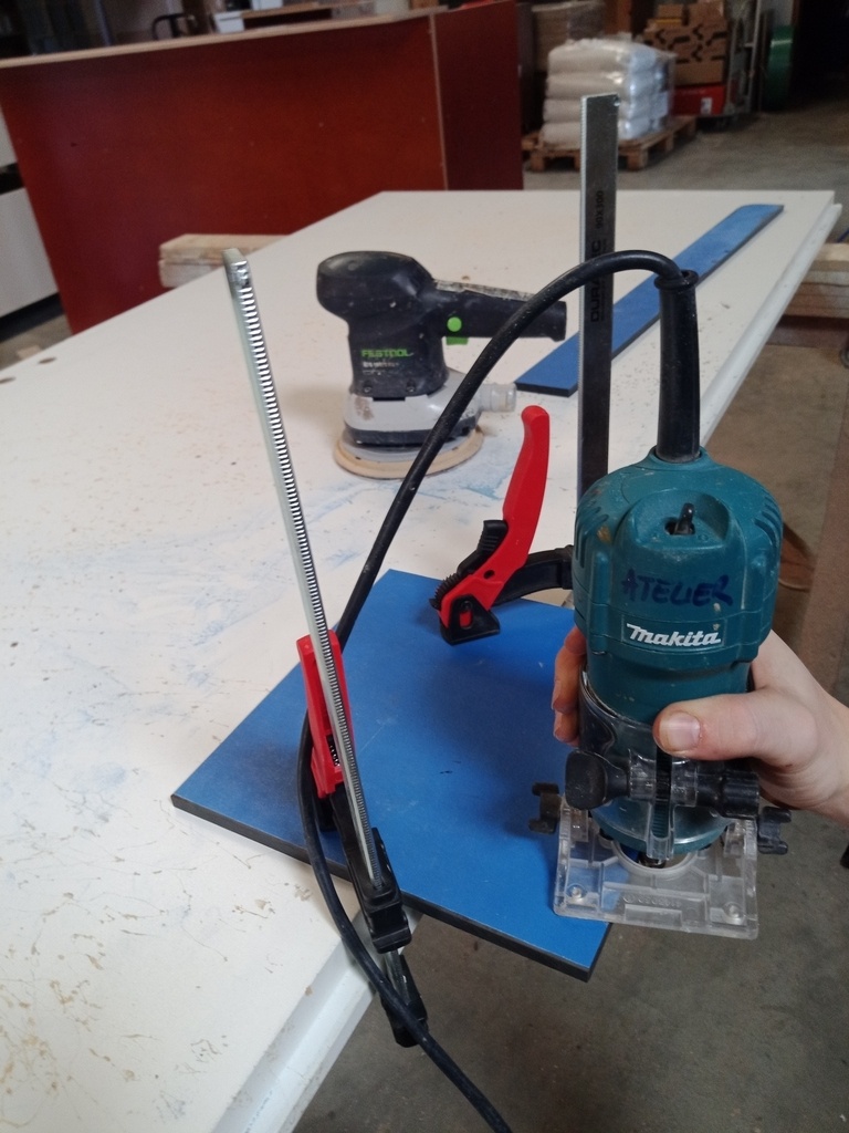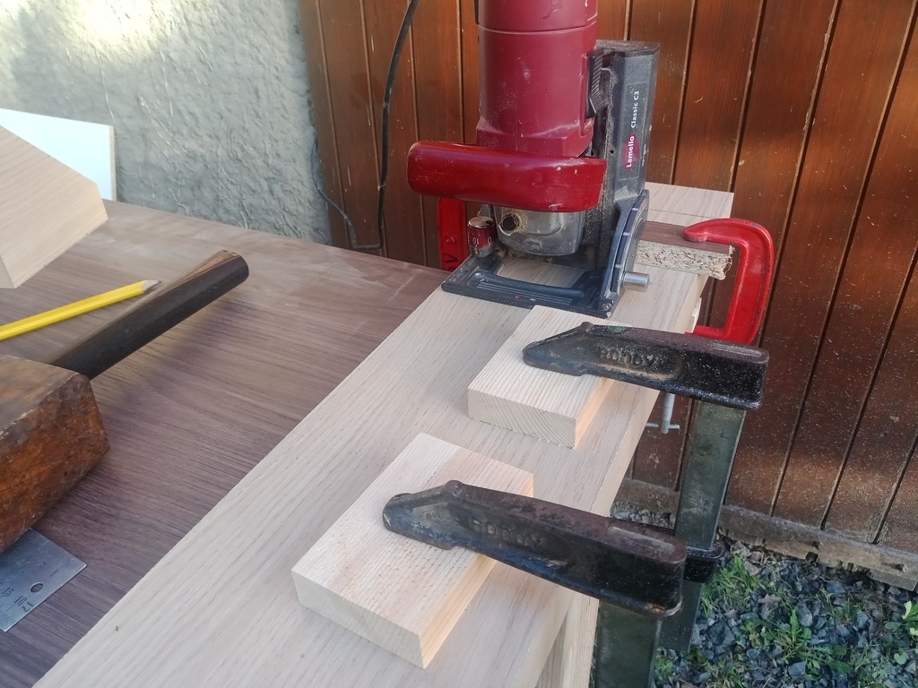 À la défonceuse, je fais les rainures qui vont permettre le réglage en profondeur. Ce réglage fonctionne de la même manière que pour la fixation de la plaque bleue et est serré avec des petites molettes.