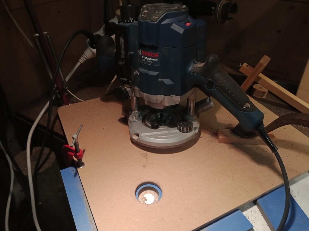 Celui-ci est en médium stratifié de 35mm (je ne me souviens plus exactement). Le le creuse à la défonceuse pour venir y encastrer la plaque, plus fine, sur laquelle sera fixé la défonceuse.