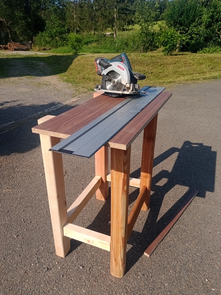 Le plateau du bas, en mélaminé, est adapté au piètement avec la scie circulaire.