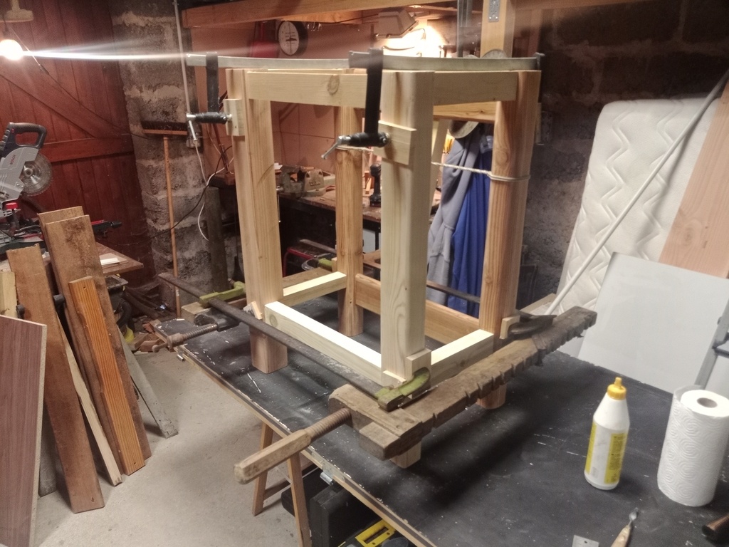 Le piètement est raboté à la main, les longueurs adaptées en fonction de la section de chaque pièce et le tout est collé et assemblé avec des tourbillons.