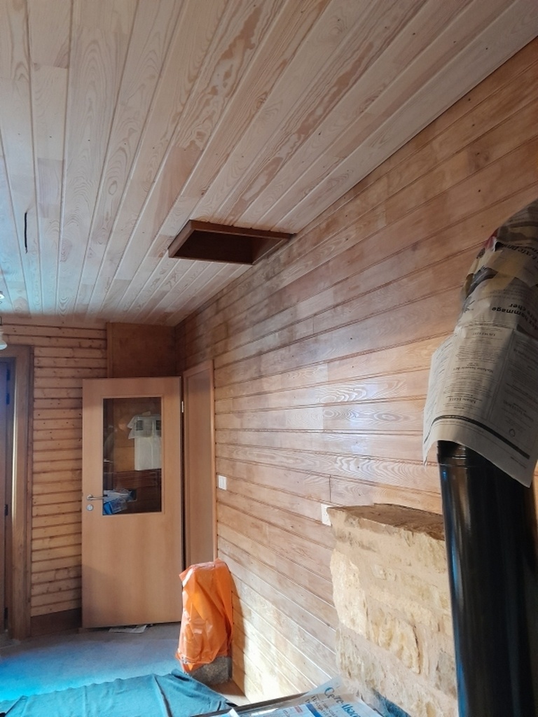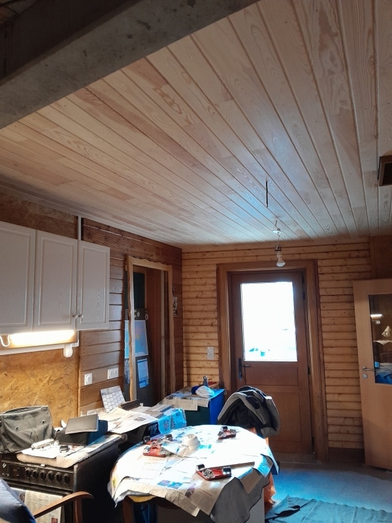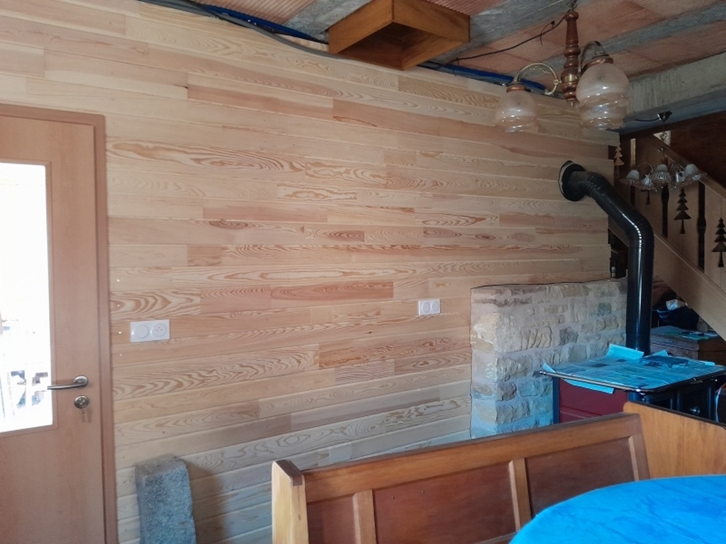 Voilà un petit chantier (enfin "petit"... façon de parler !) de lambrissage d'un mur et d'un plafond. Le client a accepté de mettre le prix dans du lambris digne de ce nom : fourni par la menuiserie Menuiseriescierieschmitt, en qui je crois que j'ai trouvé mon nouveau fournisseur !