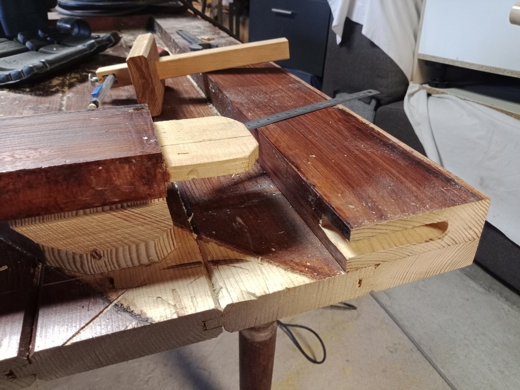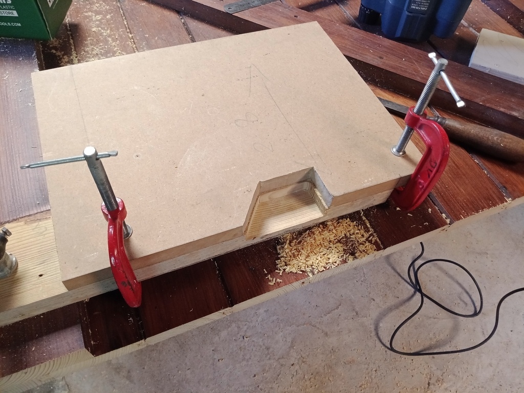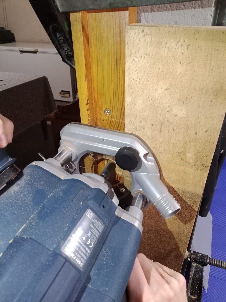 Puisque l'écharpe ne s'appuyait plus dans l'angle mais en plein milieu de la traverse, j'ai fait une sorte de tenon-mortaise à mi-bois, ce qui lui conférait plus de solidité. Pour ce faire, un gabarit en médium et une défonceuse avec une bague de copiage. Pour la hauteur, c'est fait.